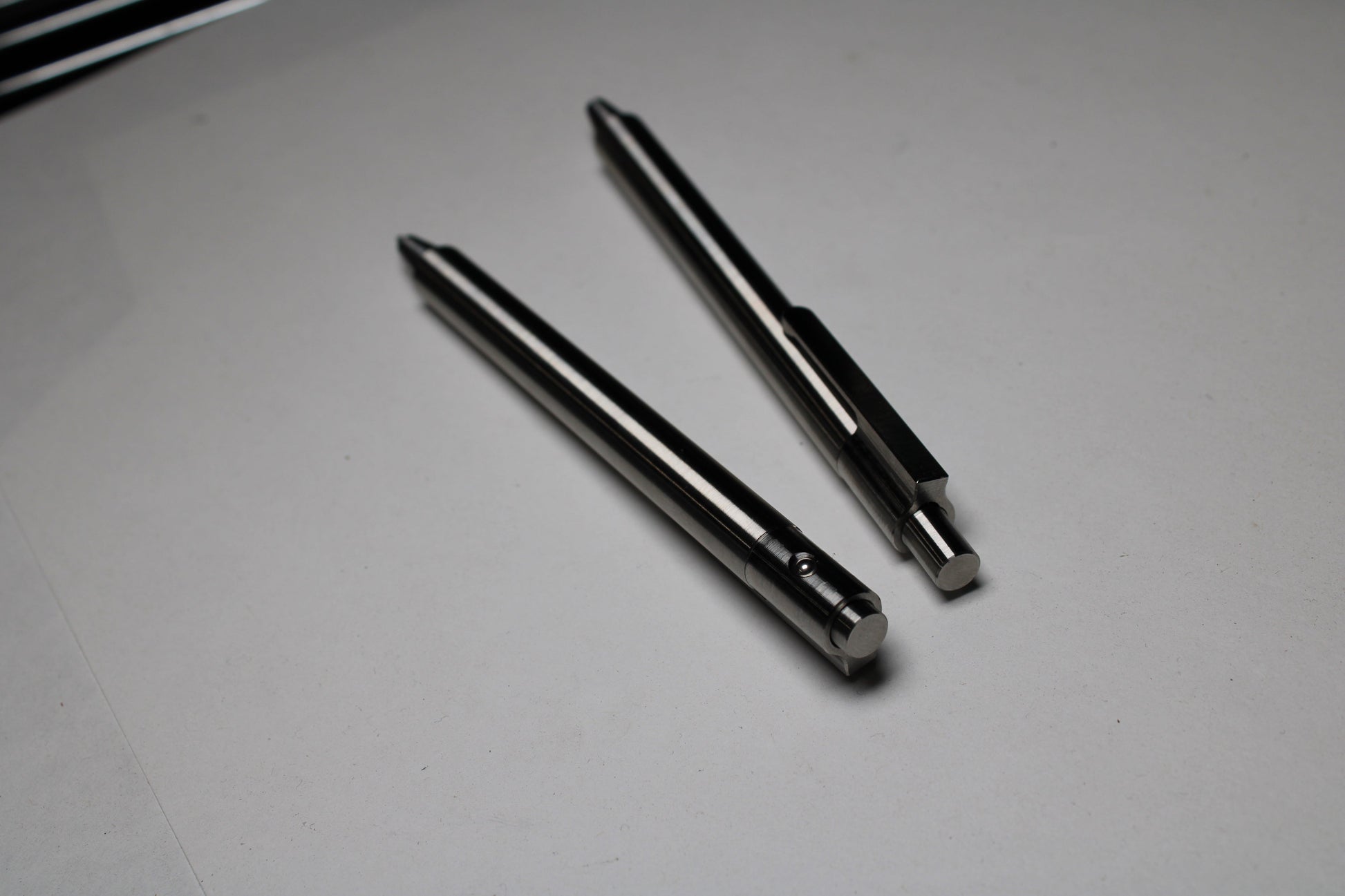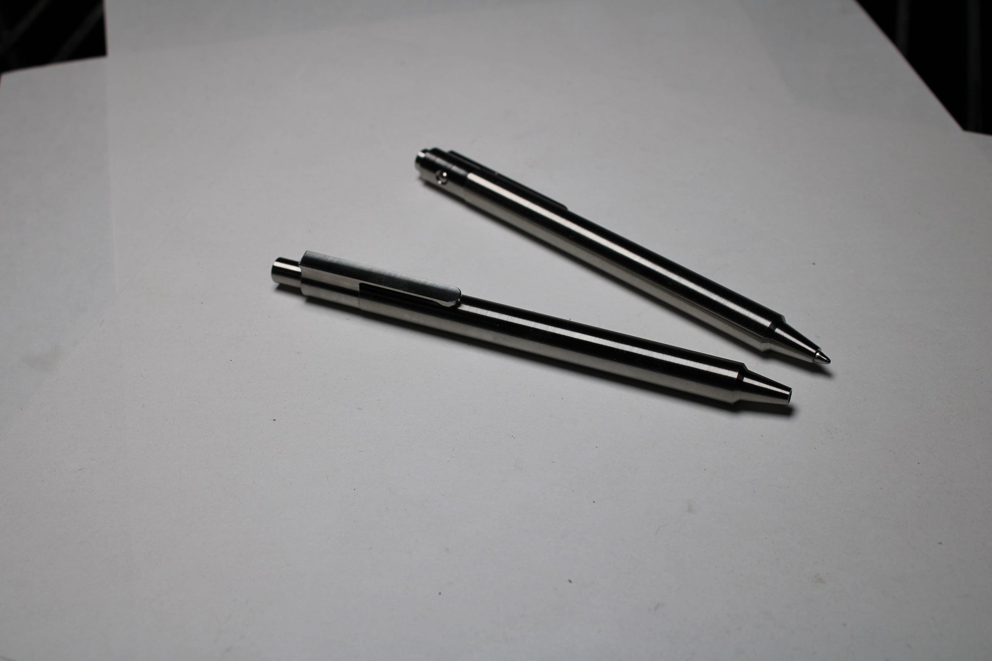 Made one at a time from solid 6Al-4V Titanium. A single 0.36" (9.14mm) diameter grip and a stepped nose section. The mechanism comes equipped this time with a clear borosilicate ball. Tip details will be the tightest yet, with the smallest land between the refill and the cone tip profile.