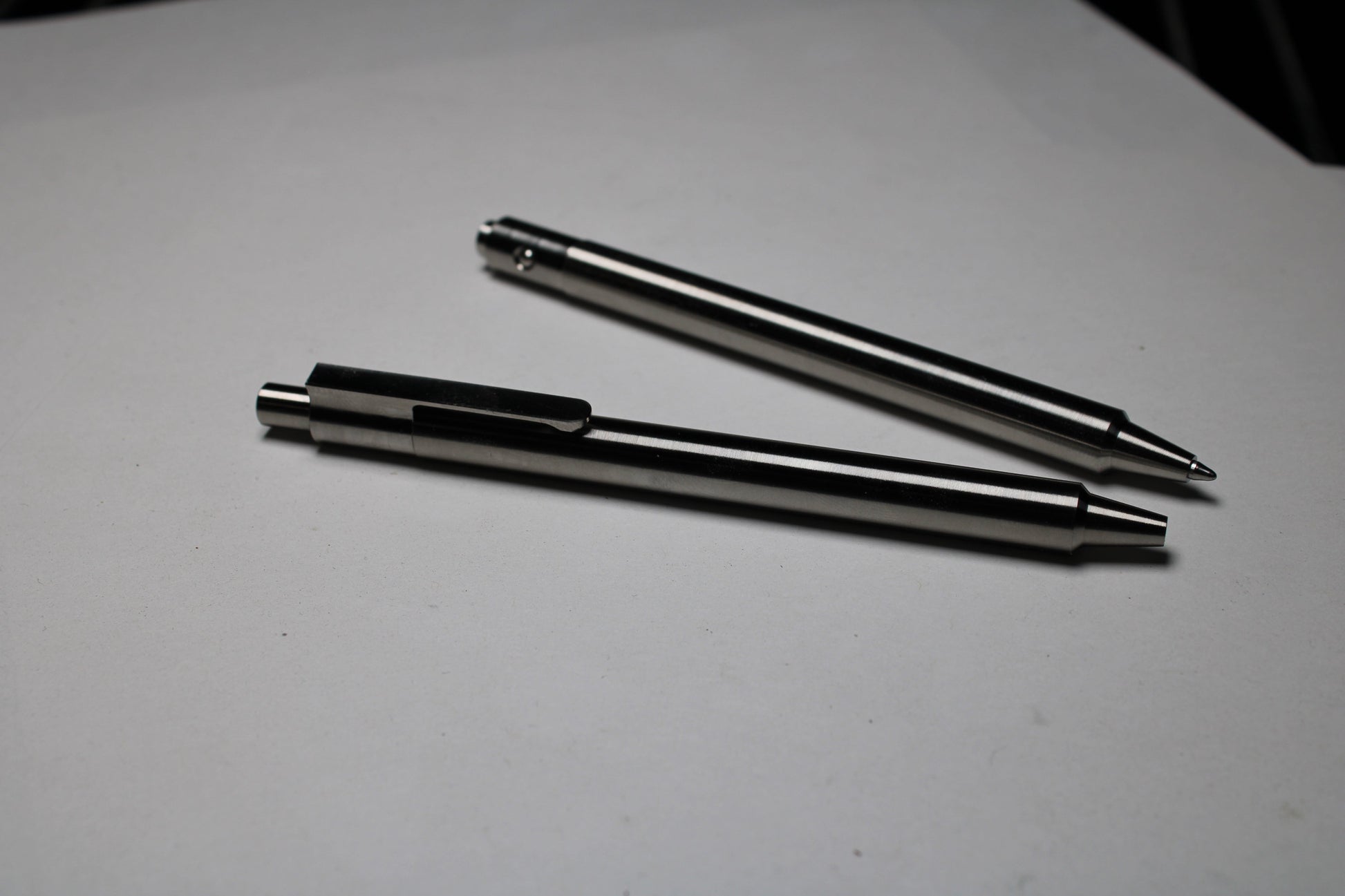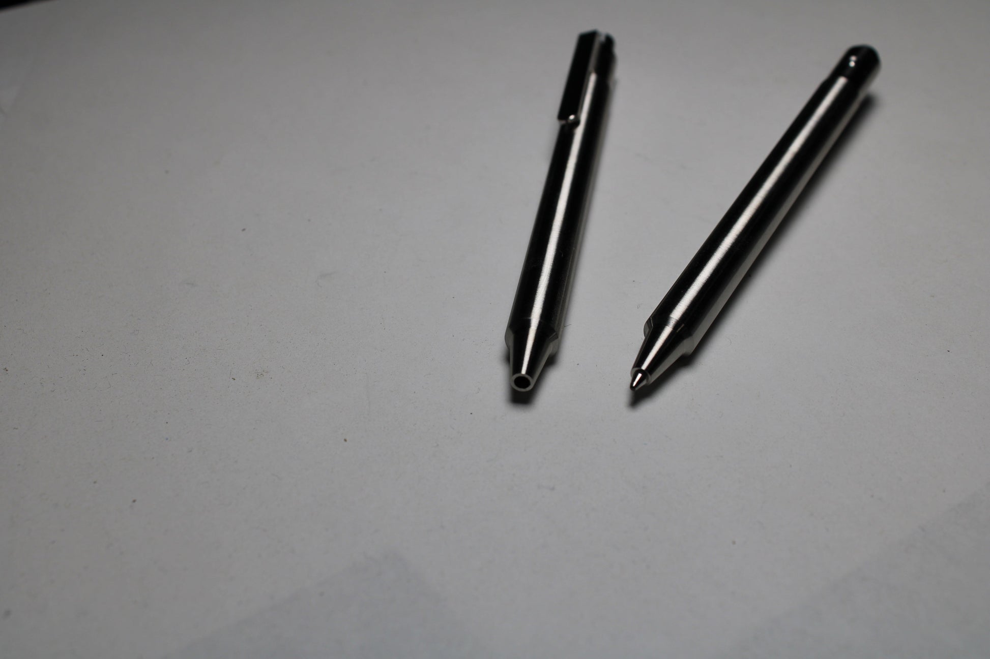 Made one at a time from solid 6Al-4V Titanium. A single 0.36" (9.14mm) diameter grip and a stepped nose section. The mechanism comes equipped this time with a clear borosilicate ball. Tip details will be the tightest yet, with the smallest land between the refill and the cone tip profile.