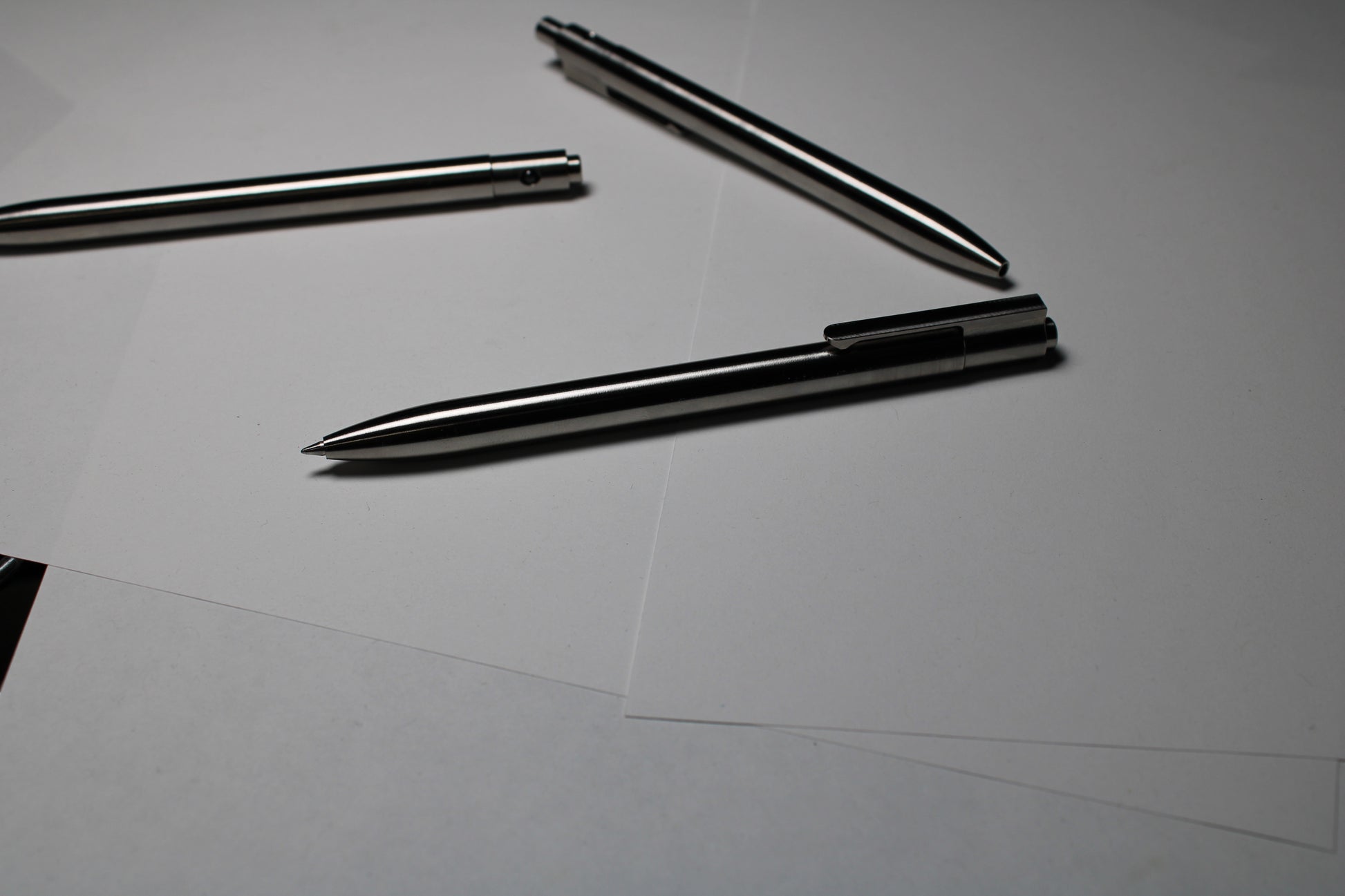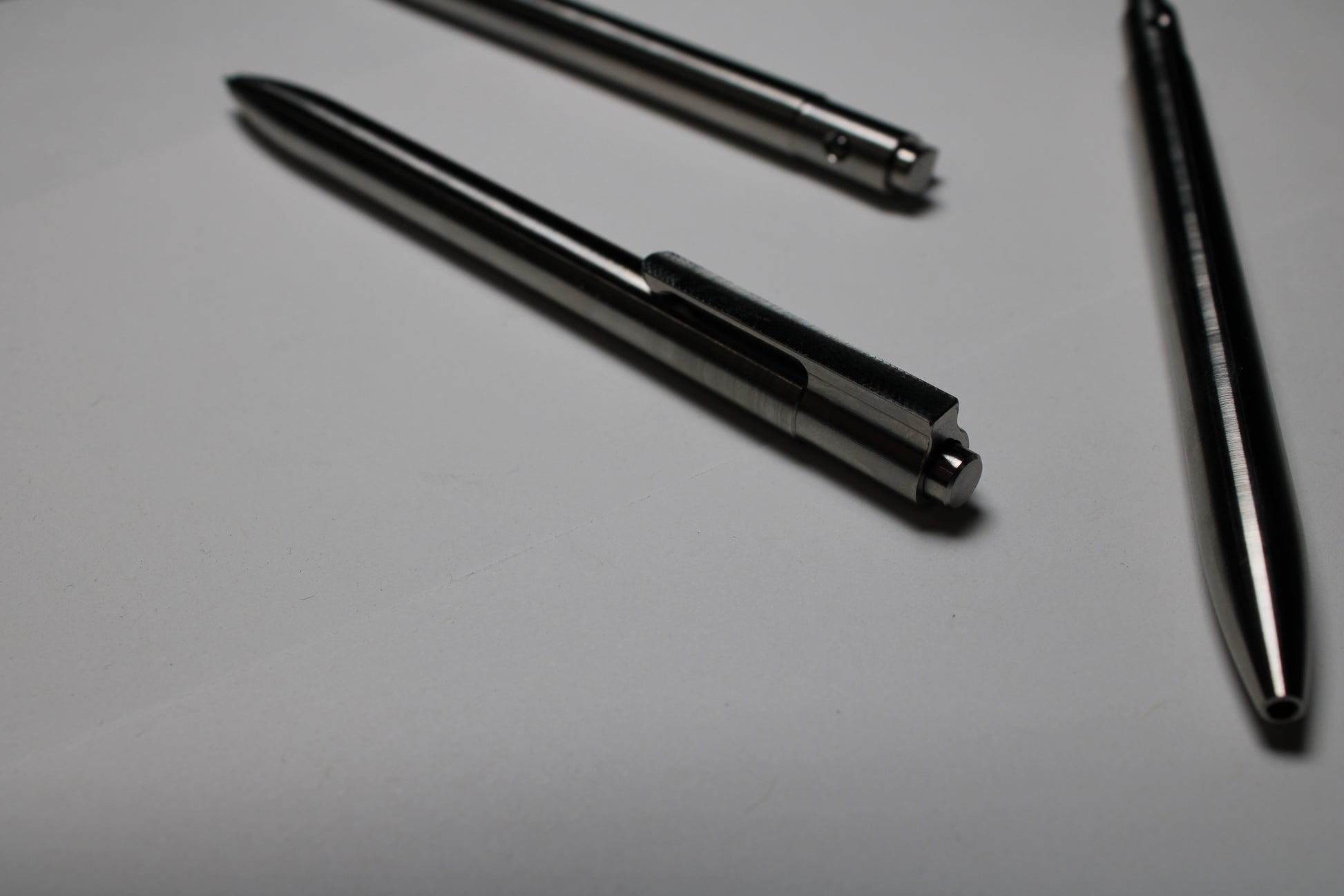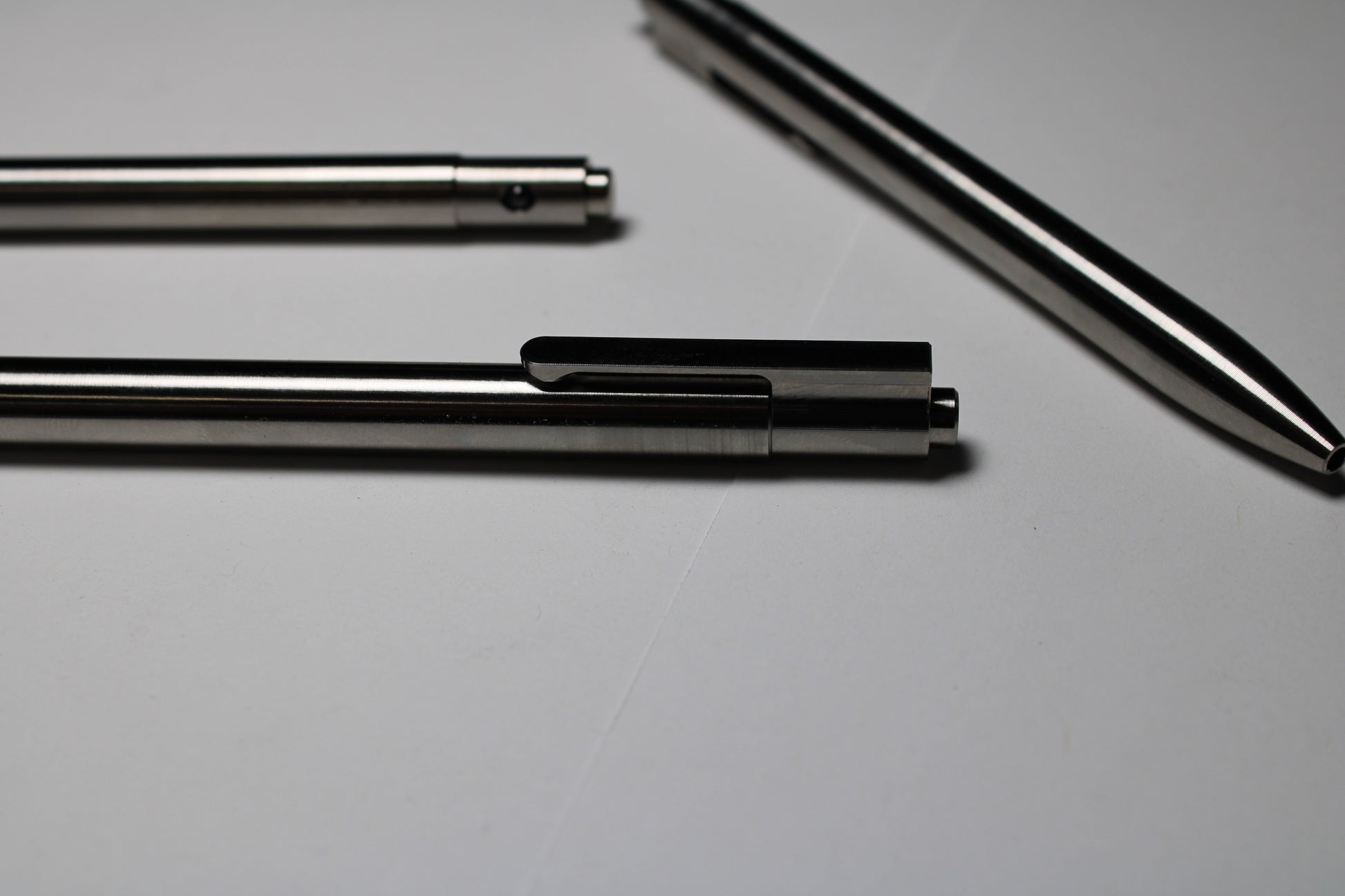 Made one at a time from solid 6Al-4V Titanium. A single 0.37" (9.40mm) diameter grip and a rounded nose section. The mechanism comes equipped this time with a black silicone nitride ball. Tip details are the tightest yet, with the smallest land between the refill and the cone tip profile. Clip holds onto thinner materials and will flex to accommodate thicker materials.