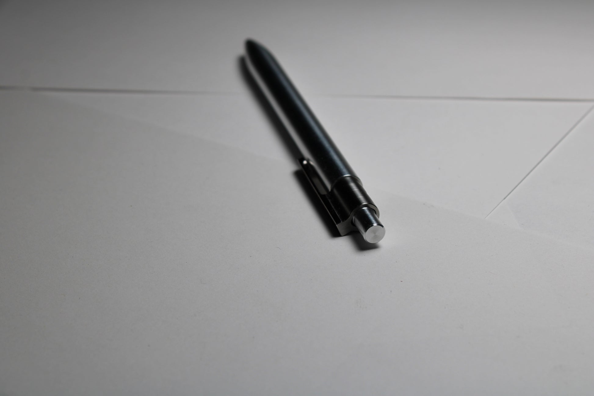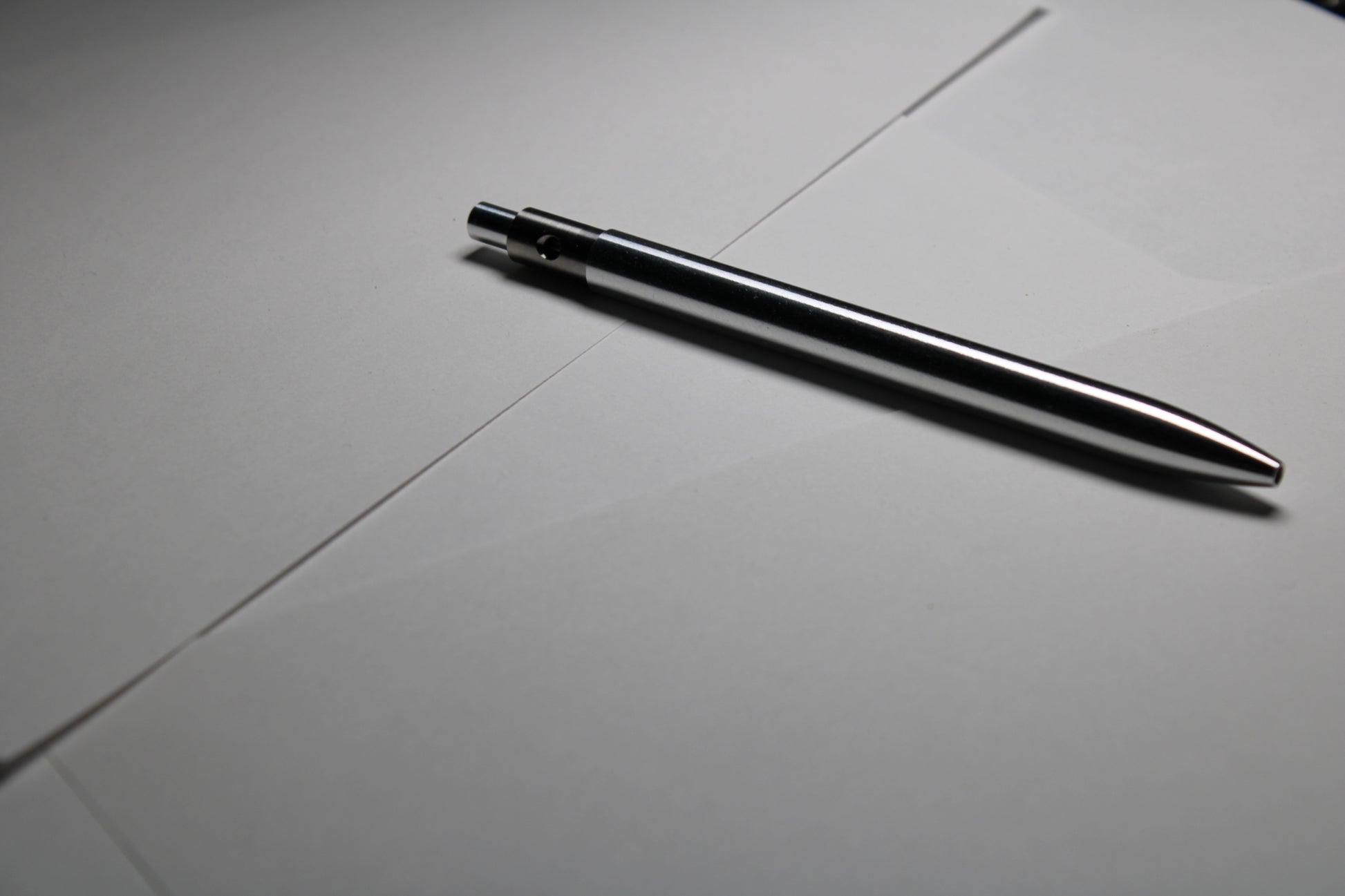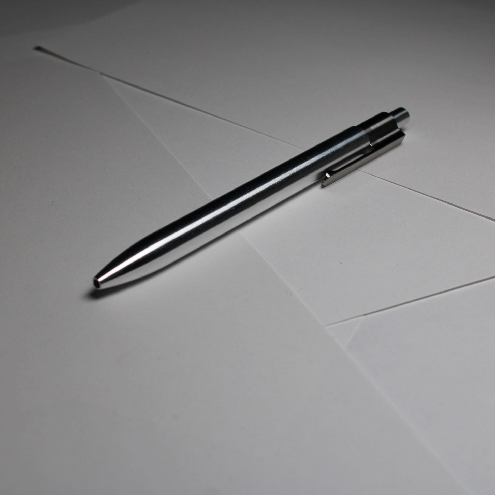 Each pen is made one at a time. The material for the pen body is 6061 Aluminum and solid 6Al-4V Titanium is used for the pen clip. A single 0.39" (9.91mm) diameter grip and a rounded nose section. Tip details are the tightest yet, with the smallest land between the refill and the cone tip profile. Clip holds onto thinner materials and will flex to accommodate thicker materials.