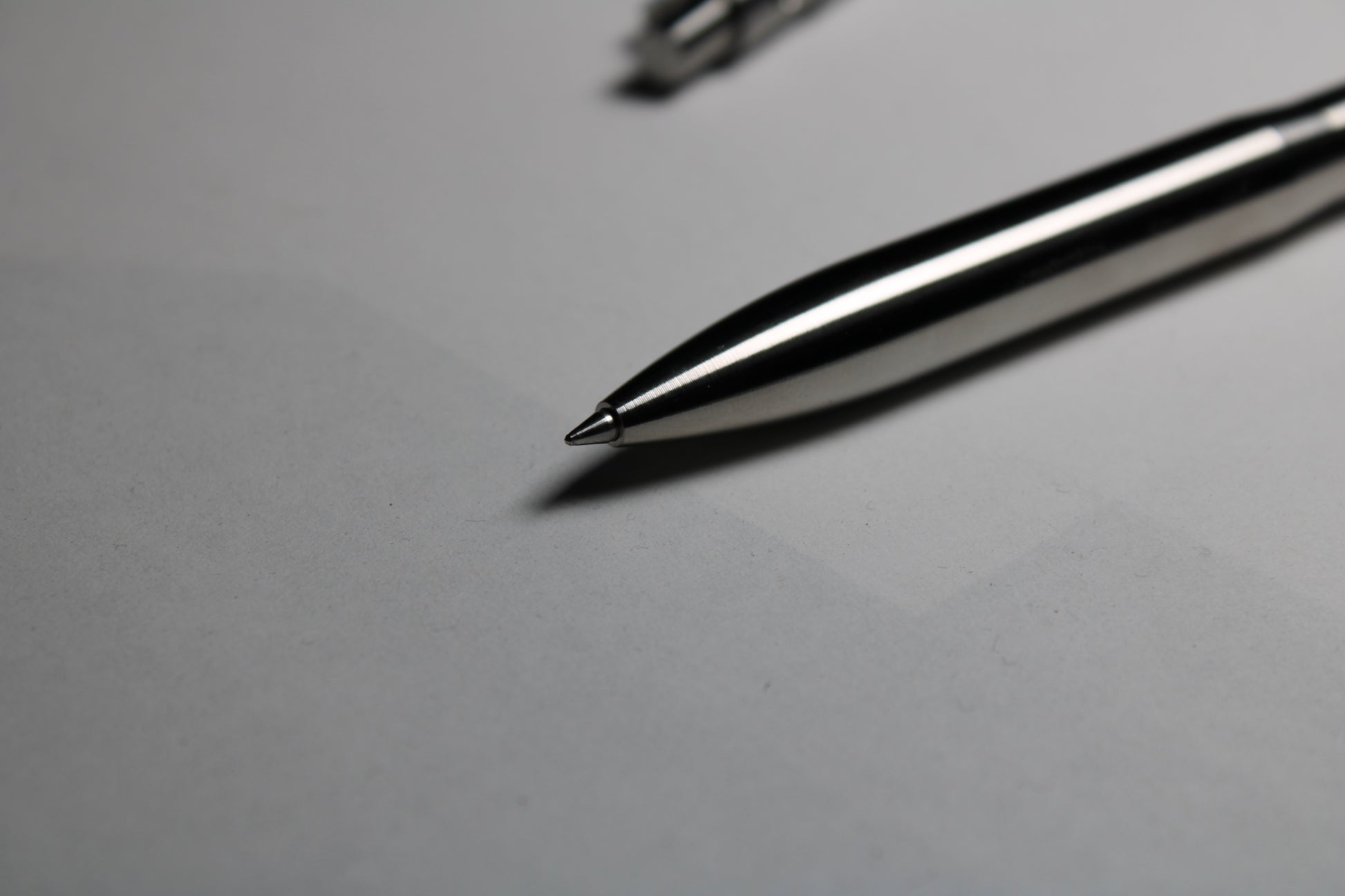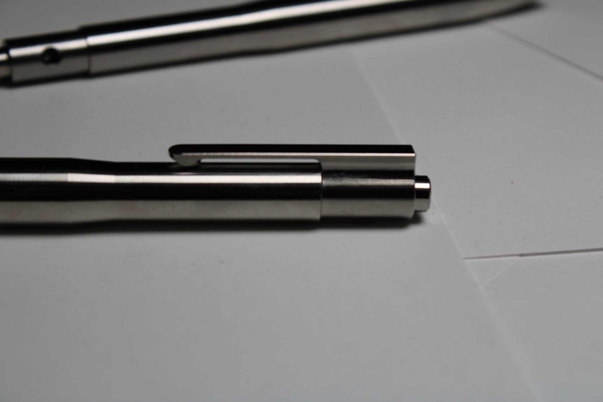 Made one at a time from solid 6Al-4V Titanium. A 0.44" (11.18mm) diameter grip and a rounded nose section. Tip details are the tightest yet, with the smallest land between the refill and the cone tip profile. Clip holds onto thinner materials and will flex to accommodate thicker materials.