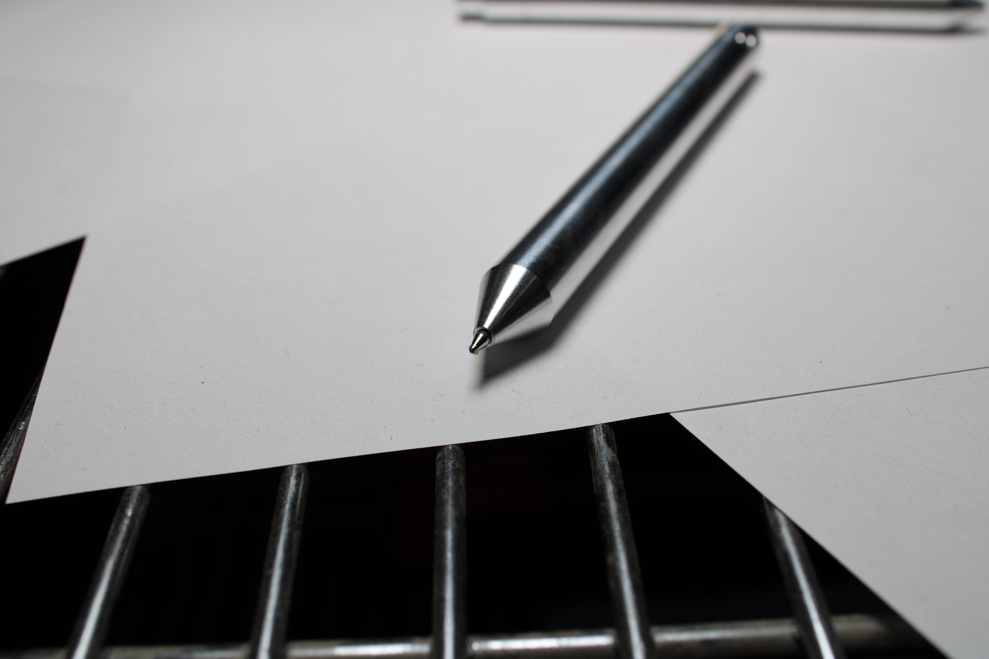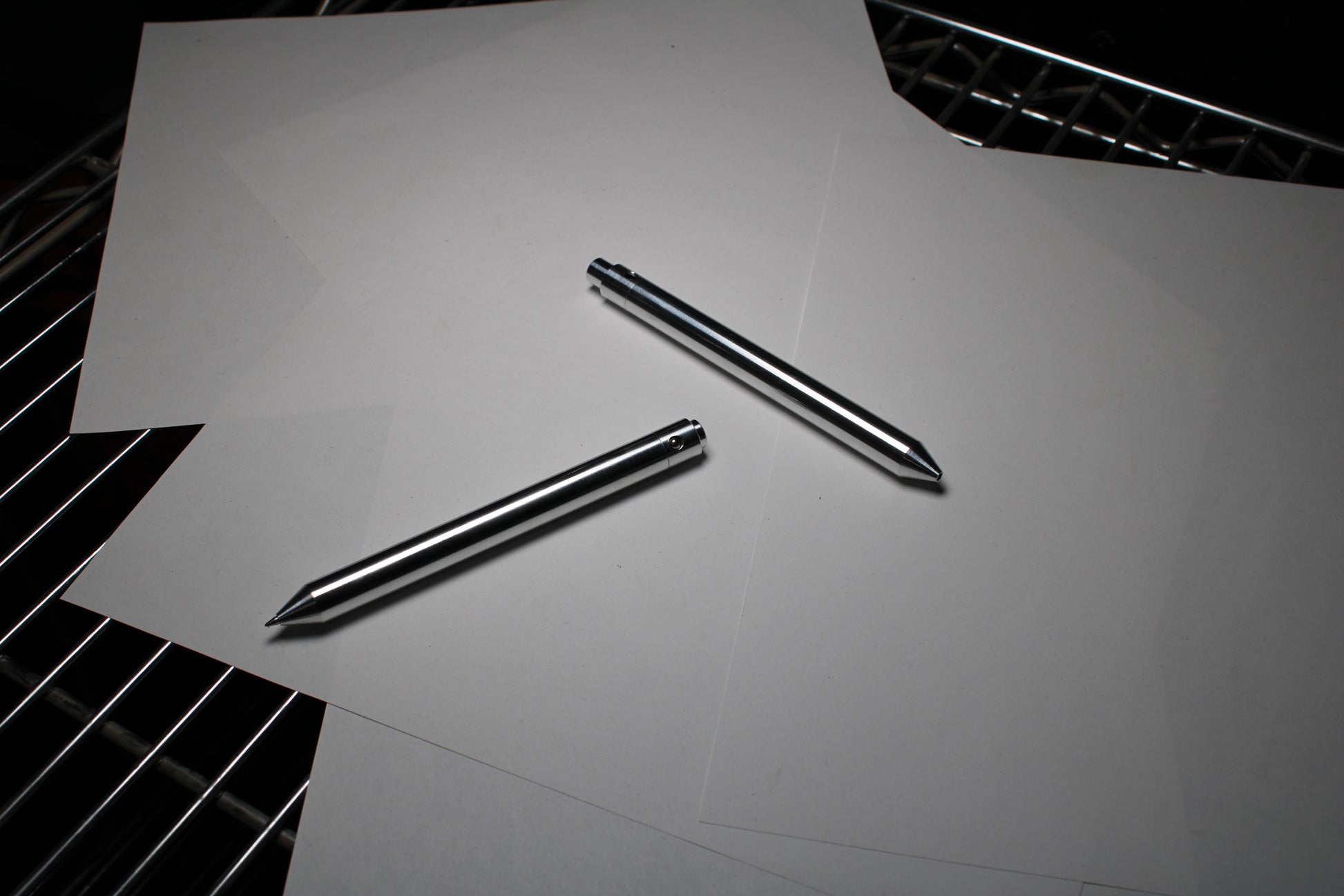Made of super shiny and lightweight raw 6061 Aluminum. Machined finishes really pop. Mechanism is super snappy in this version and uses a larger 4mm ball for the detent. There is a single 0.47" (11.94mm) diameter grip and a conical nose section. This design is made to fit the Pentel EnerGel and other refills that share the 2.3mm nose diameter.