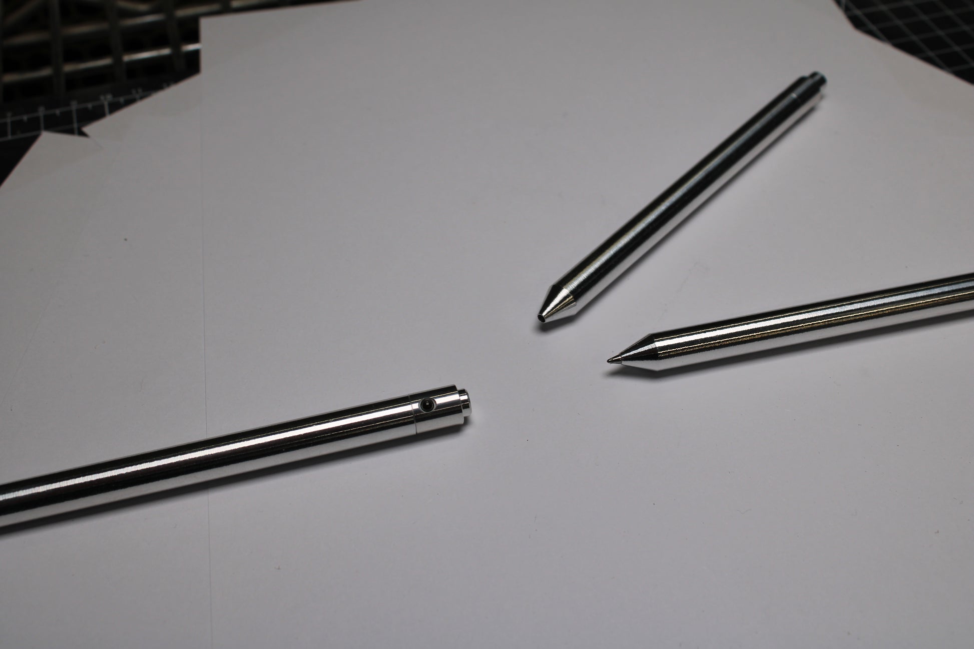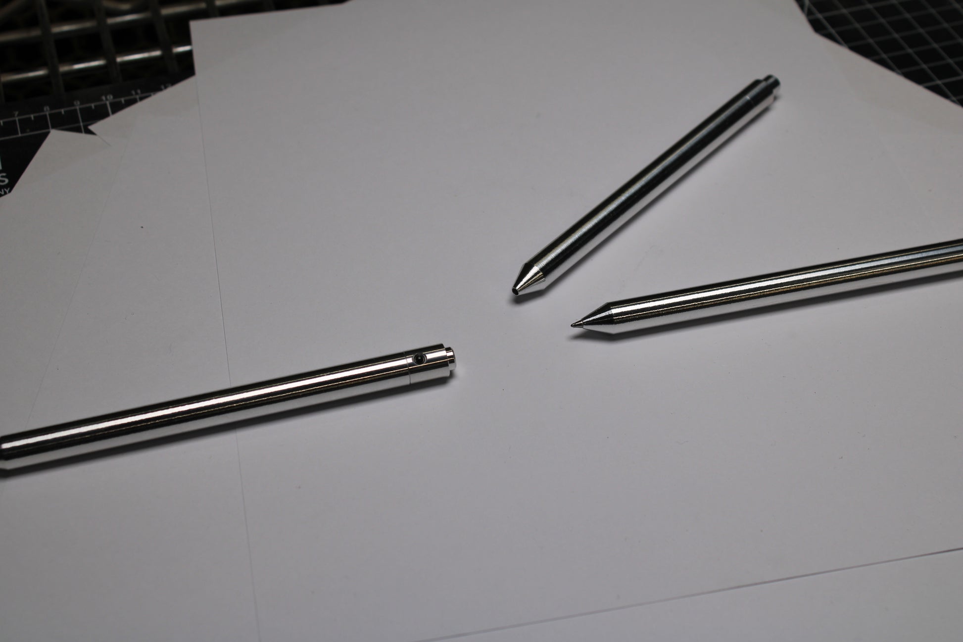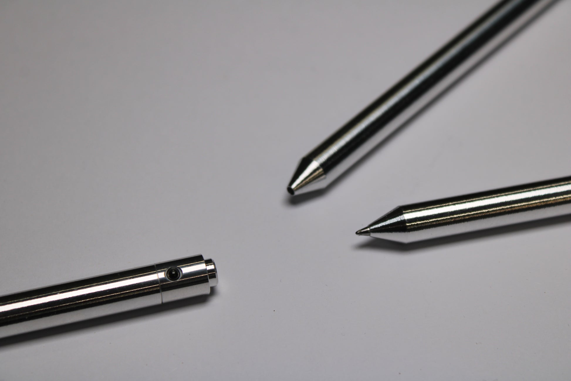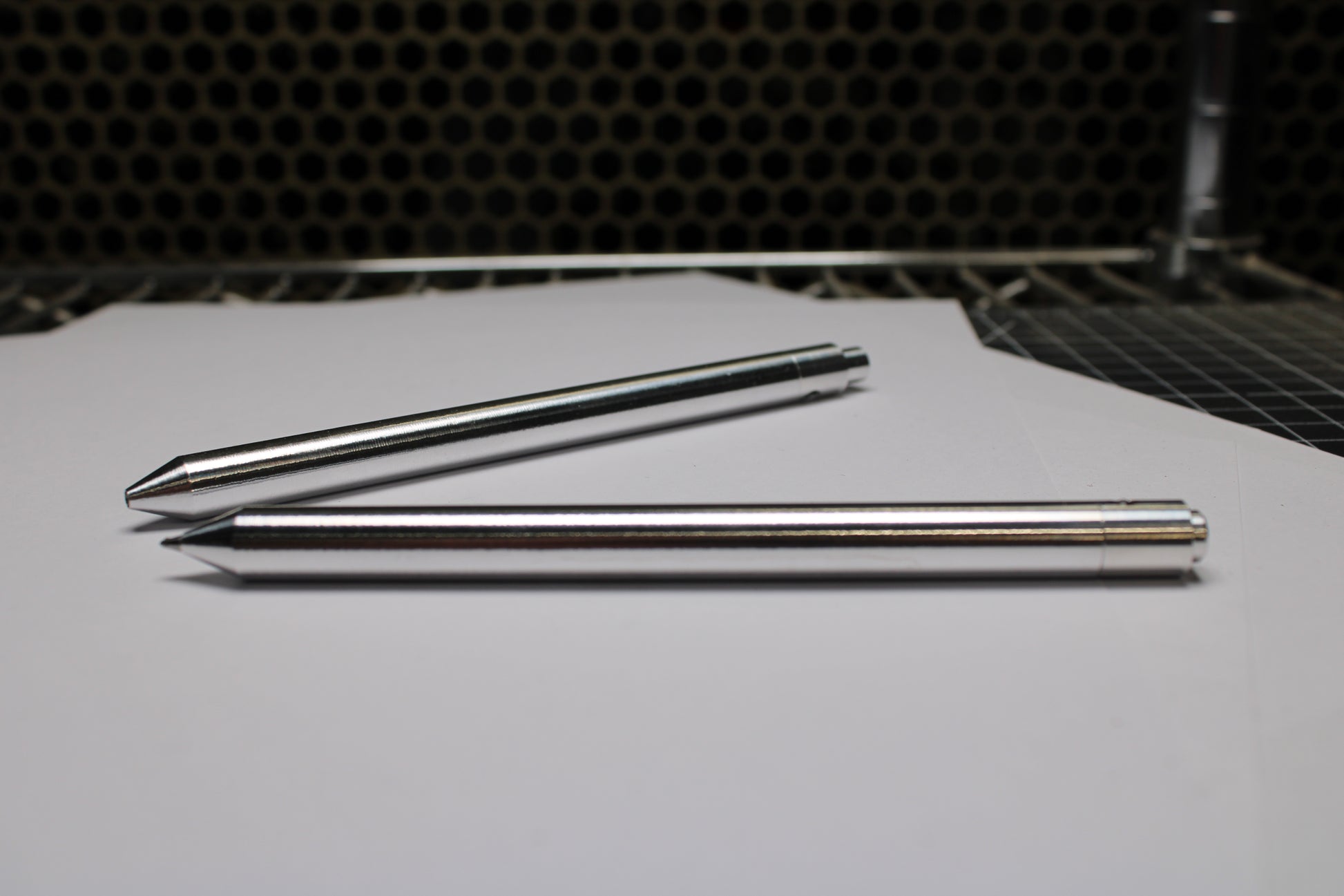 A light note taking weight at 16.88g in a 0.38"(9.65 mm) diameter with a smooth body that varies in texture towards the conical business end for suitable grip. Raw aluminum is a softer metal and will wear against harder materials, but the shiny lustre and light weight make it an attractive option.