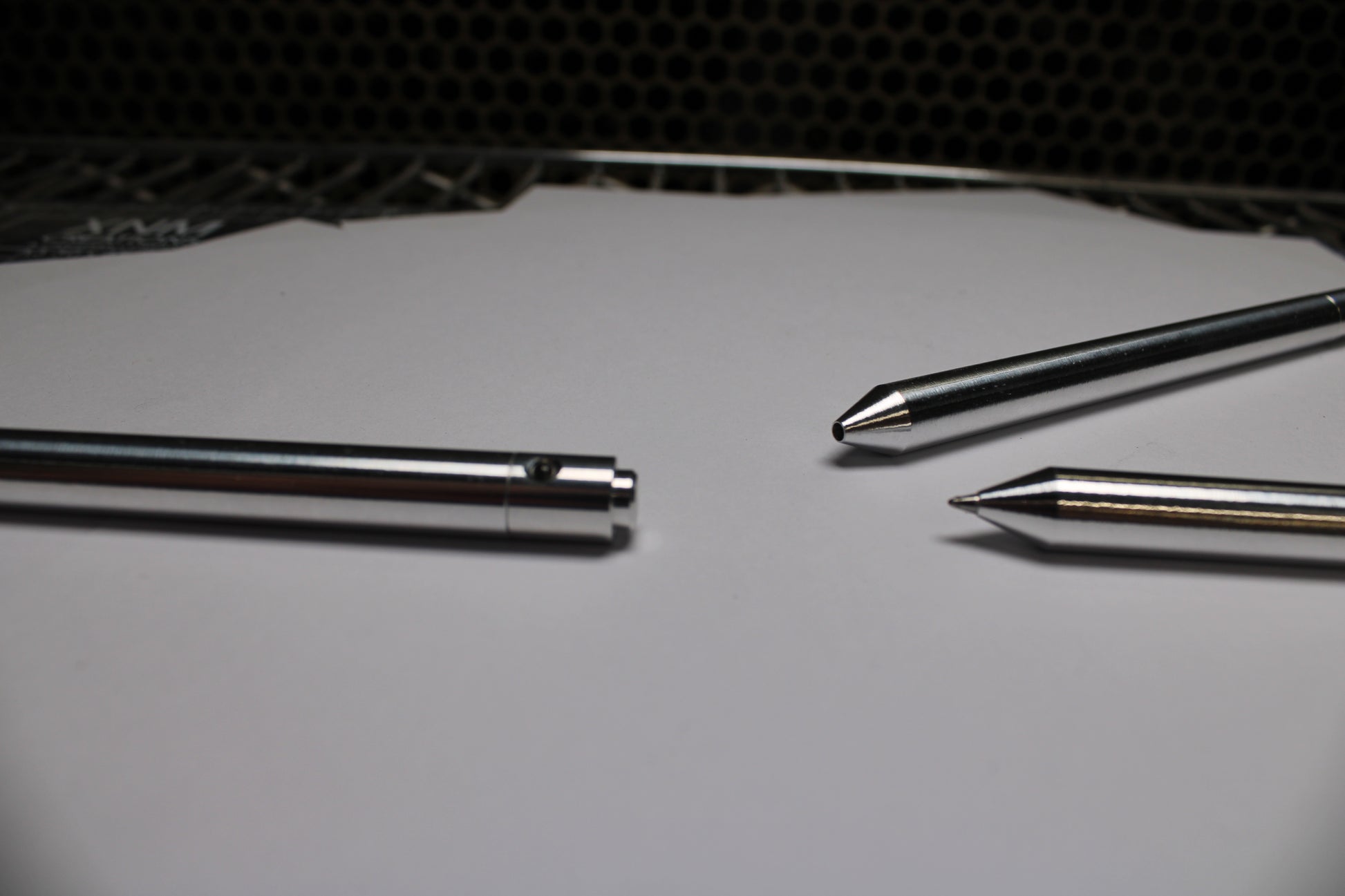 The mechanism comes equipped with one stainless steel bearing ball and one borosilicate glass ball. Tip details are extremely tight with a small land between the refill and the conical section.