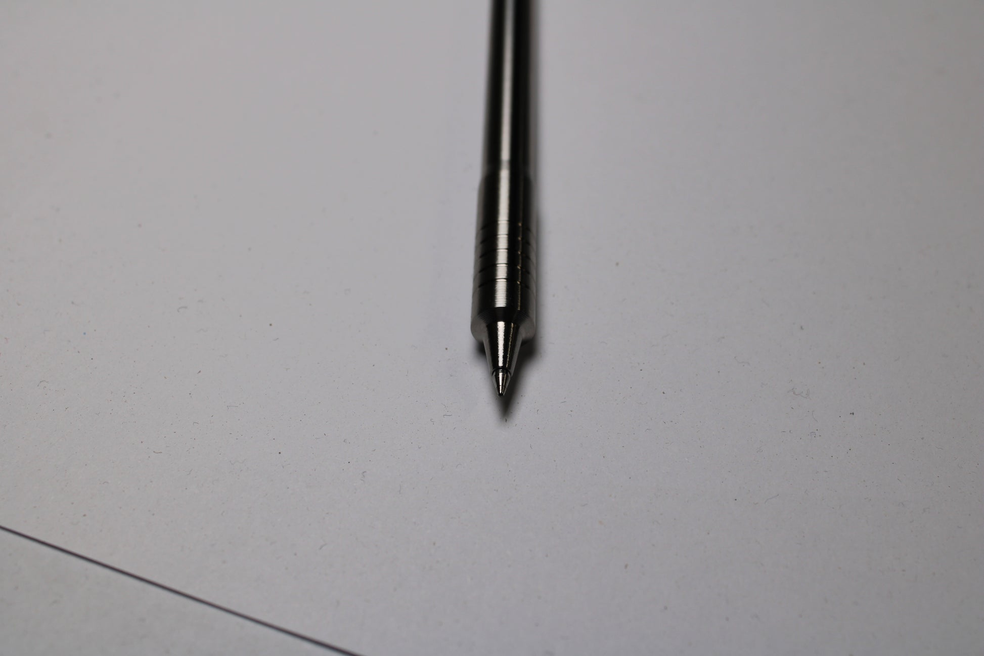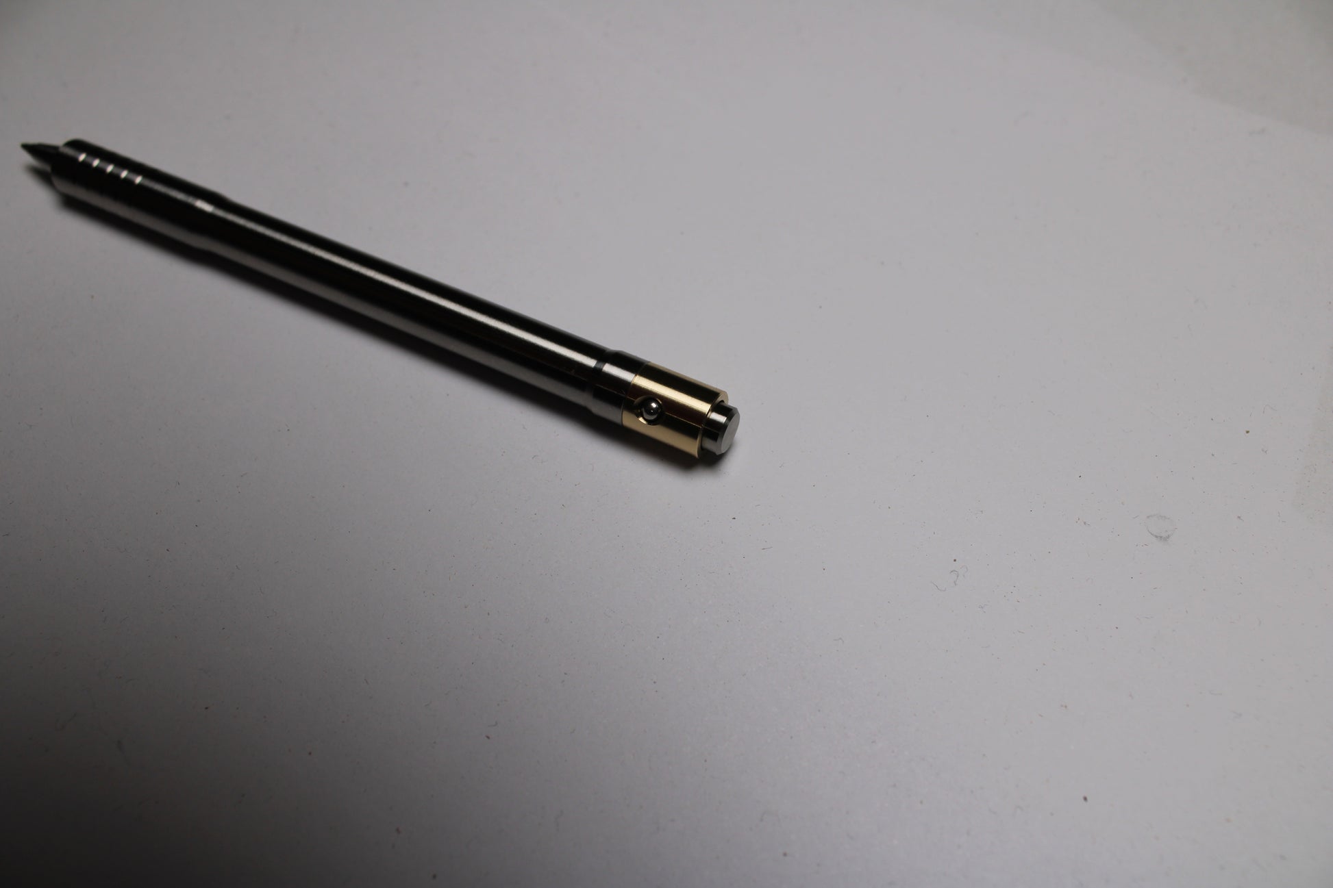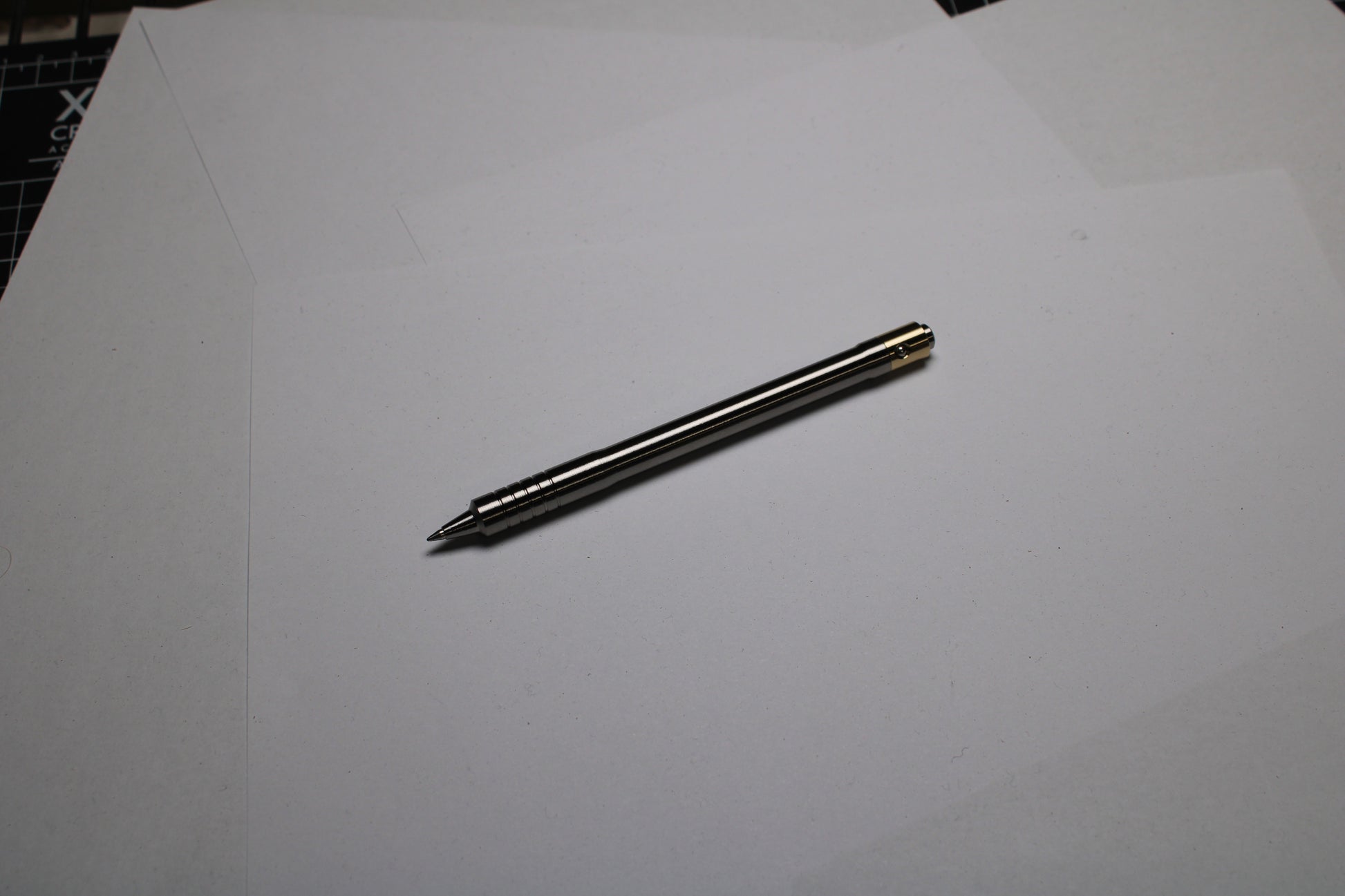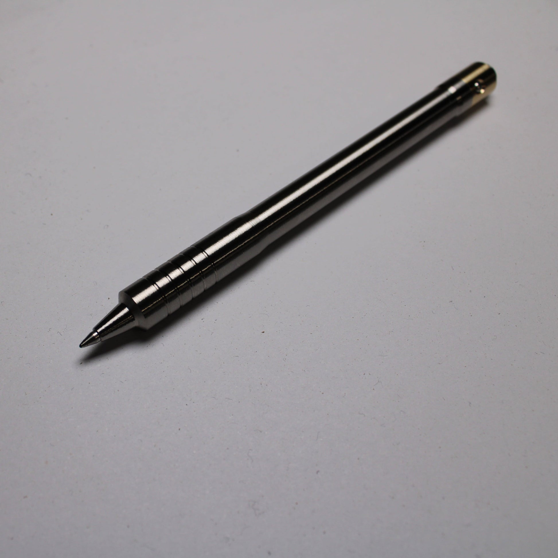 Made out of the tough and hard solid bar stock 6Al-4V Grade 5 Titanium. The mechanism comes equipped with stainless steel bearing balls. Tip details are extremely tight with a small land between the refill, and the conical section.