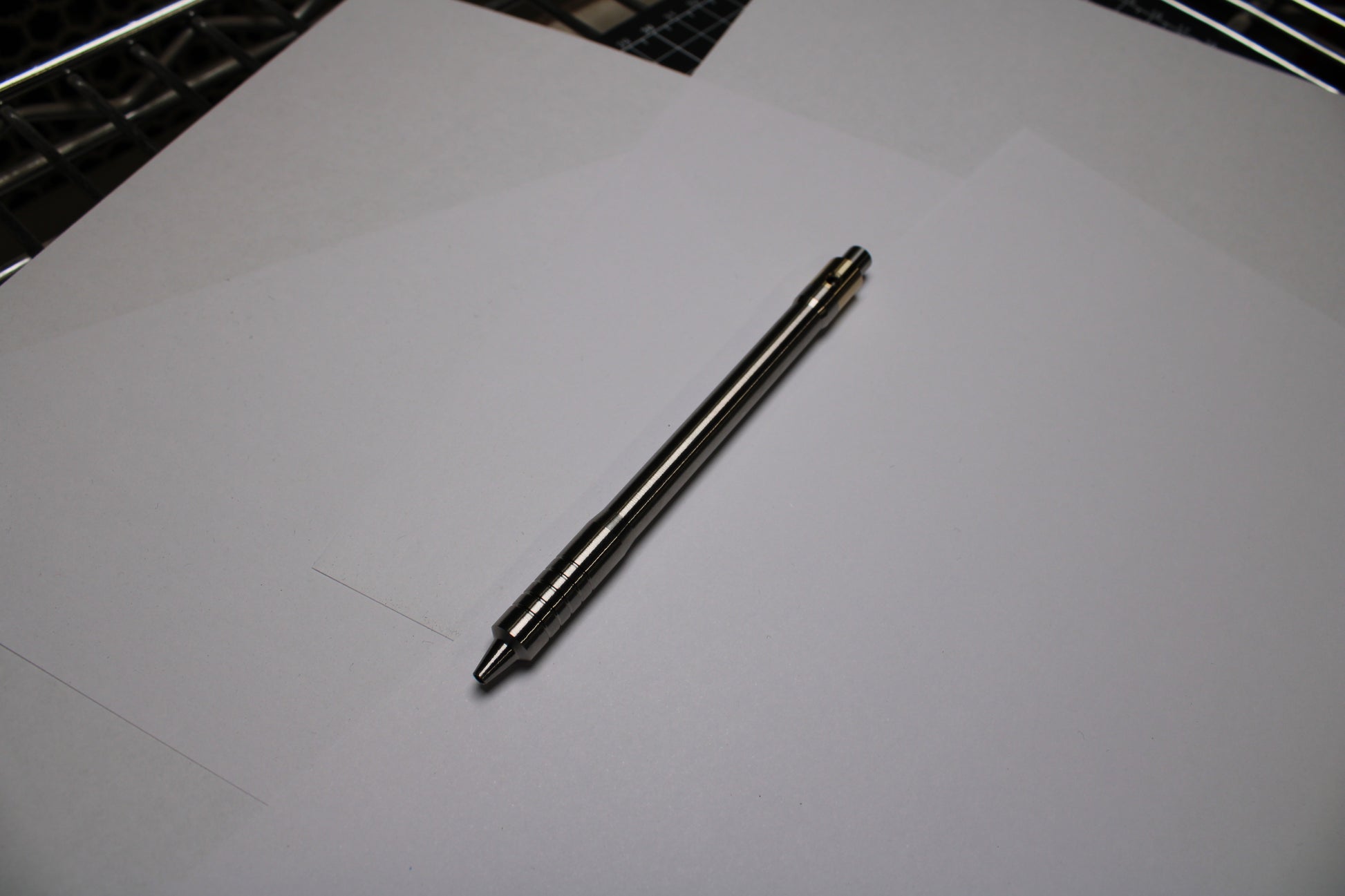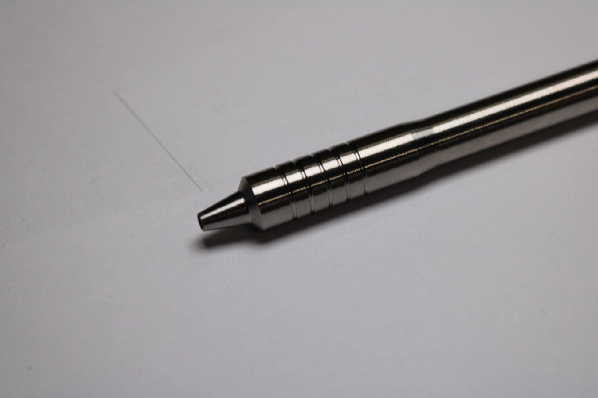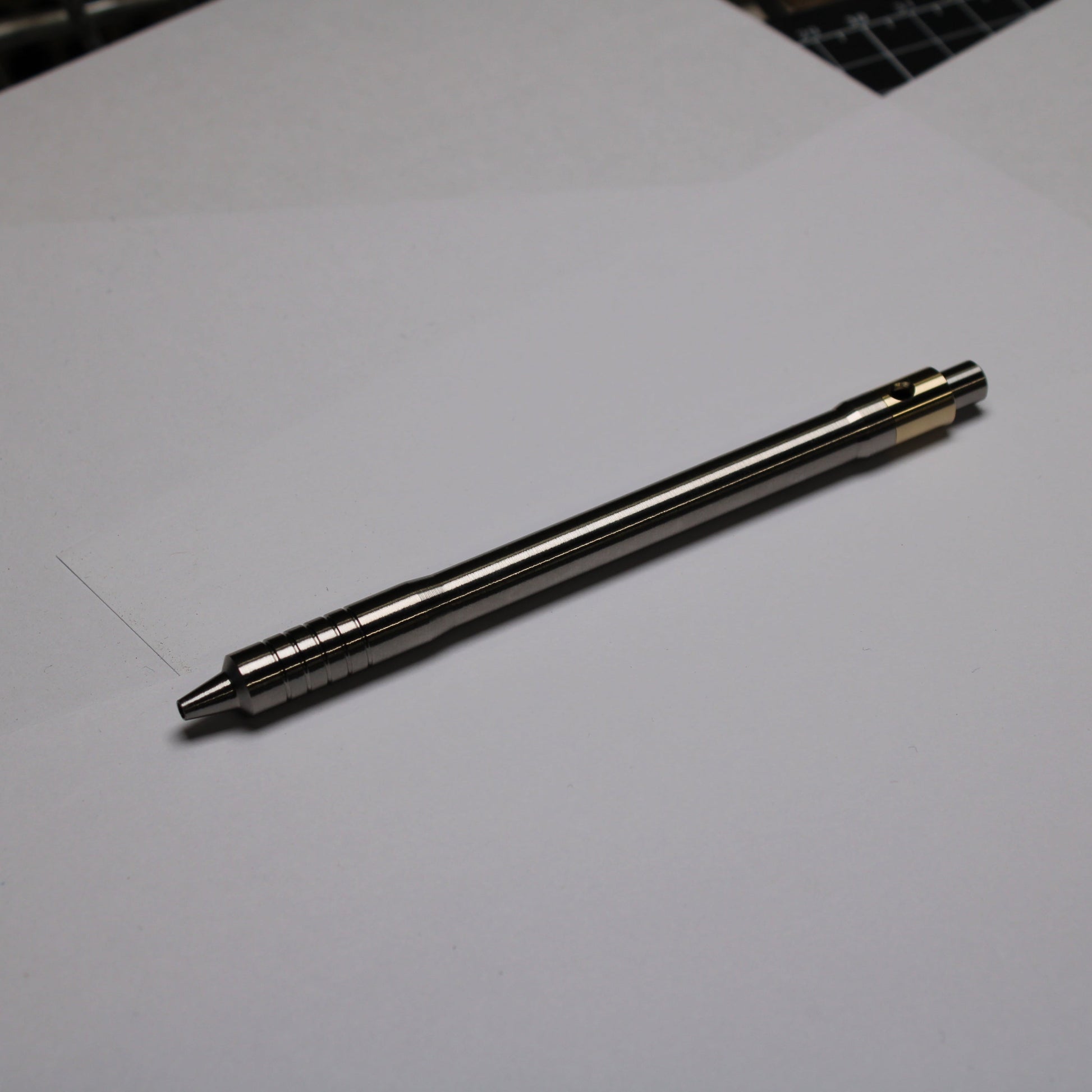 Made out of the tough and hard solid bar stock 6Al-4V Grade 5 Titanium. The mechanism comes equipped with stainless steel bearing balls. Tip details are extremely tight with a small land between the refill, and the conical section.