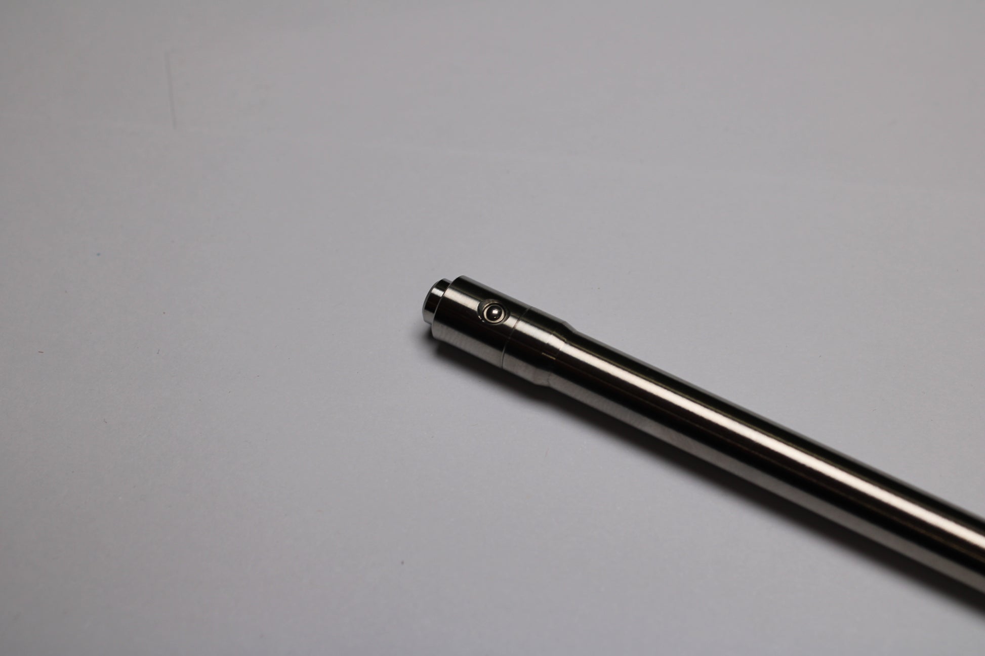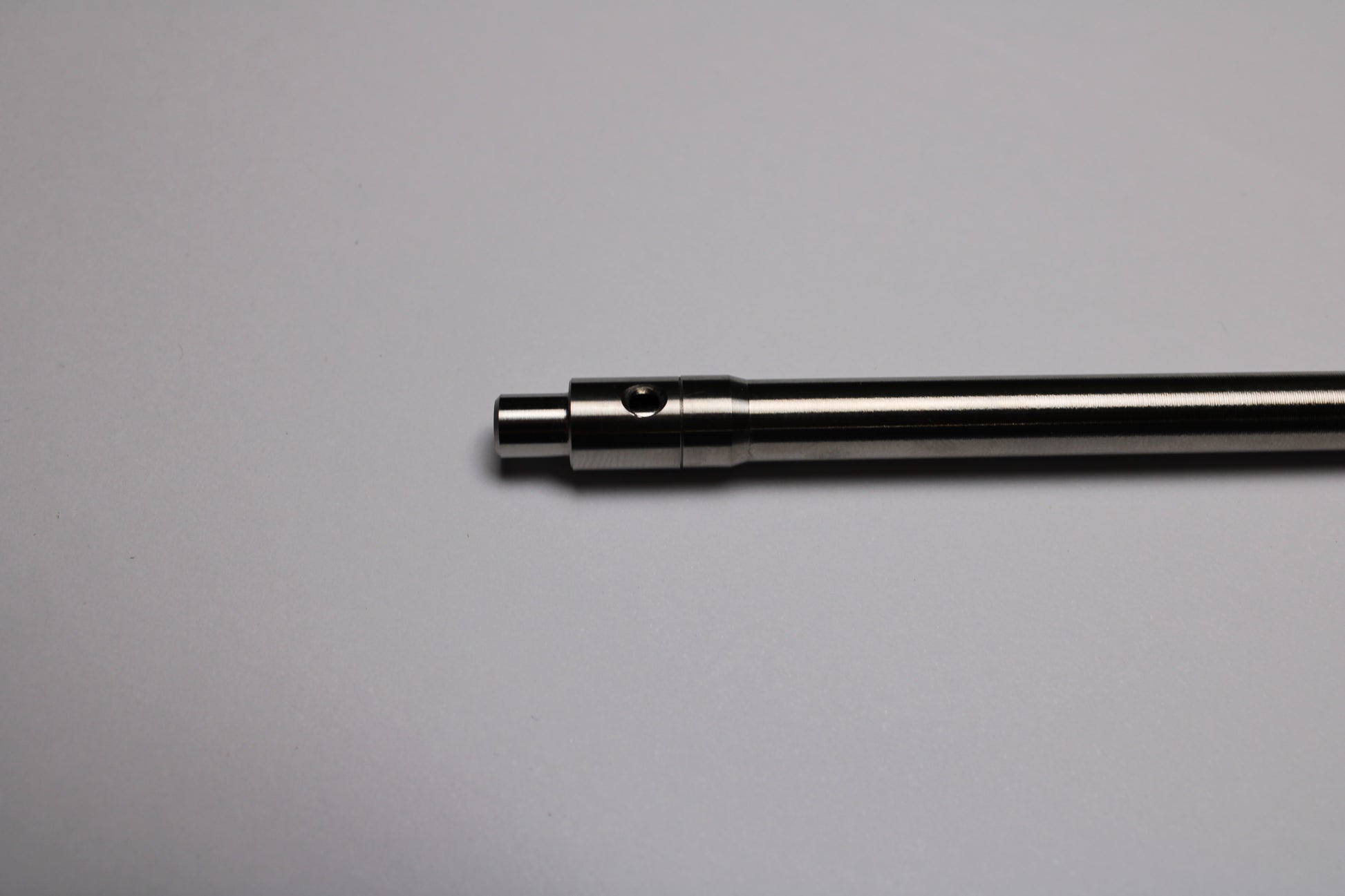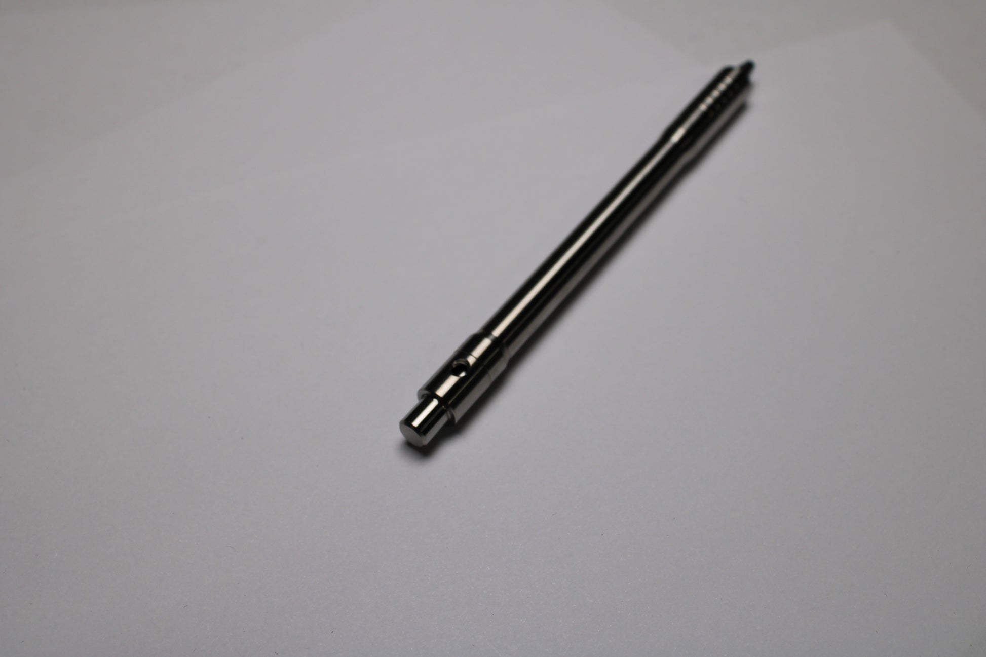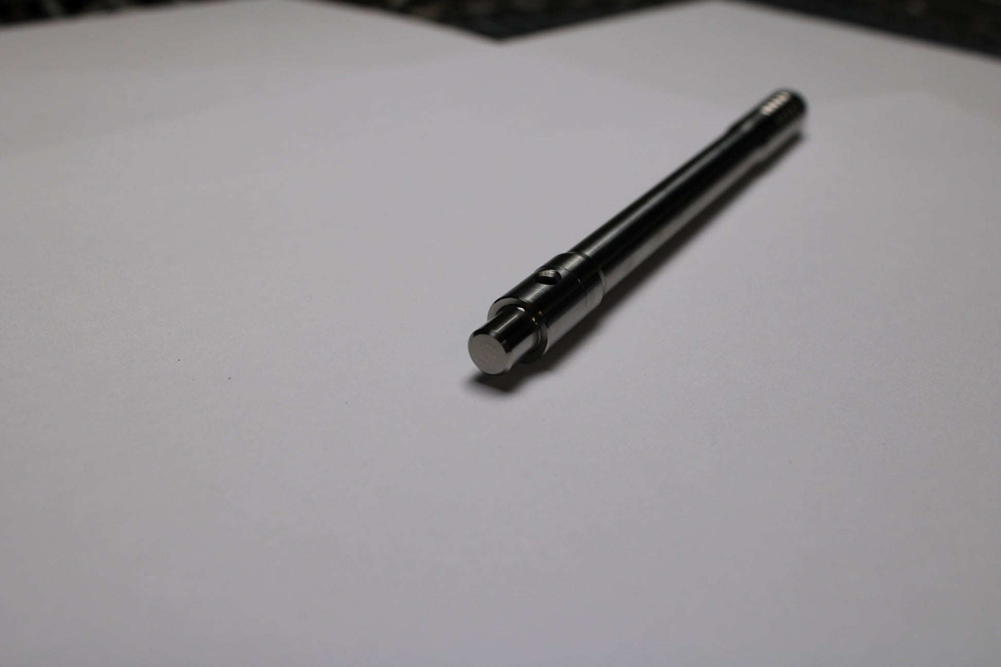 Made out of the tough and hard solid bar stock 6Al-4V Grade 5 Titanium in a 0.38"(9.65mm) diameter with a recessed middle section down to 0.34"(8.64mm). No o-ring bumper for this design. Spring rates are pretty optimum removing the need for the bumper. Uses a 1/8" (0.125") bearing ball and a custom made precision secondary spring.