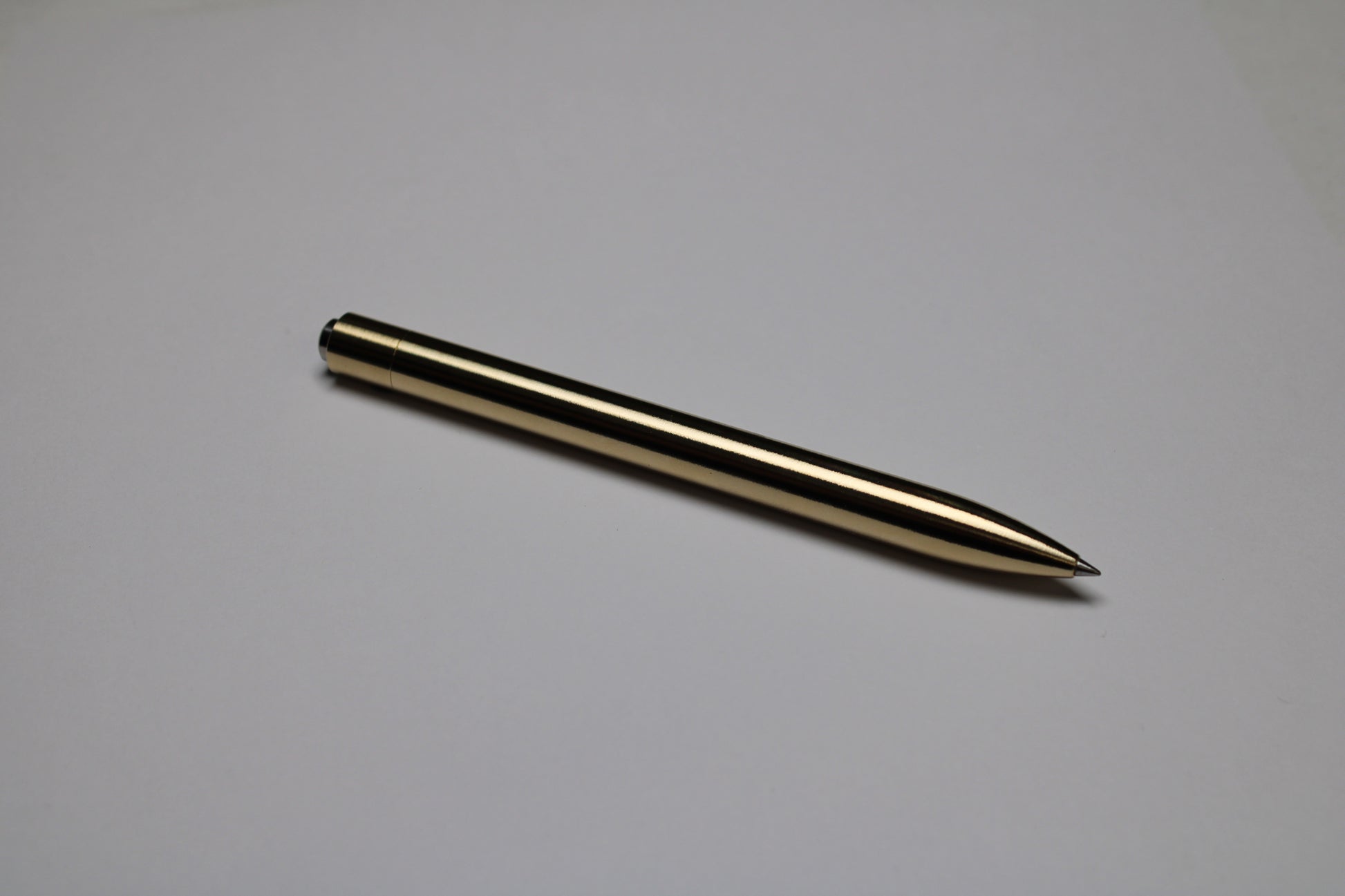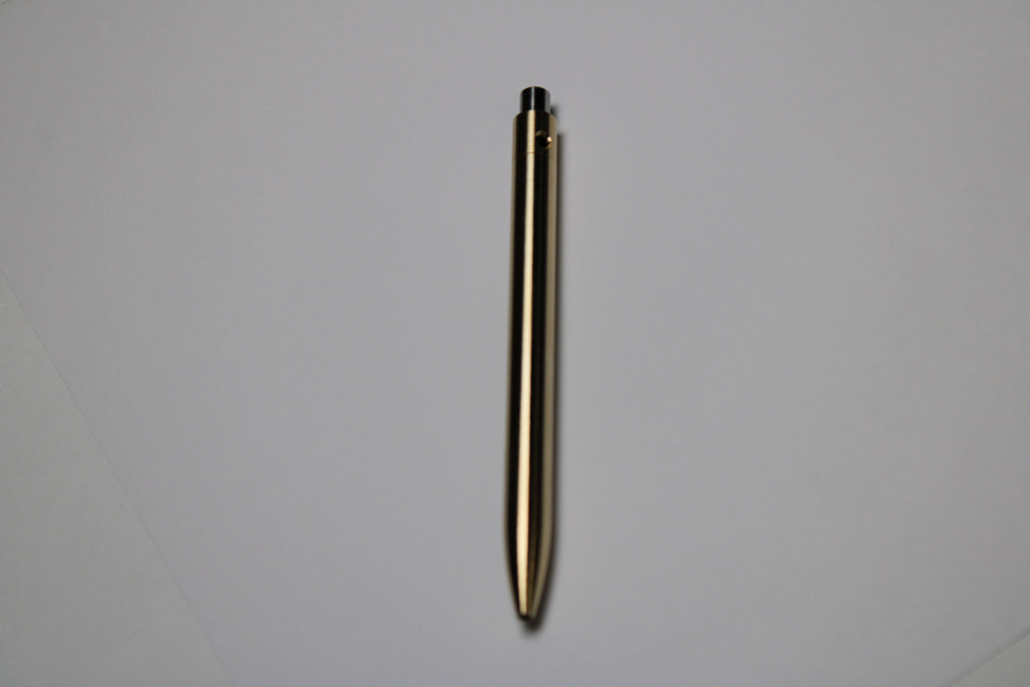 A hefty C63000 Nickel Aluminum Bronze unit with a 6Al-4V Titanium button. I am liking rollerball refills more these days, but these refills may need some some tuning when replacing them. The metal tip often has a small burr where it joins, and I've had to use a bit of fine sandpaper to take it off.