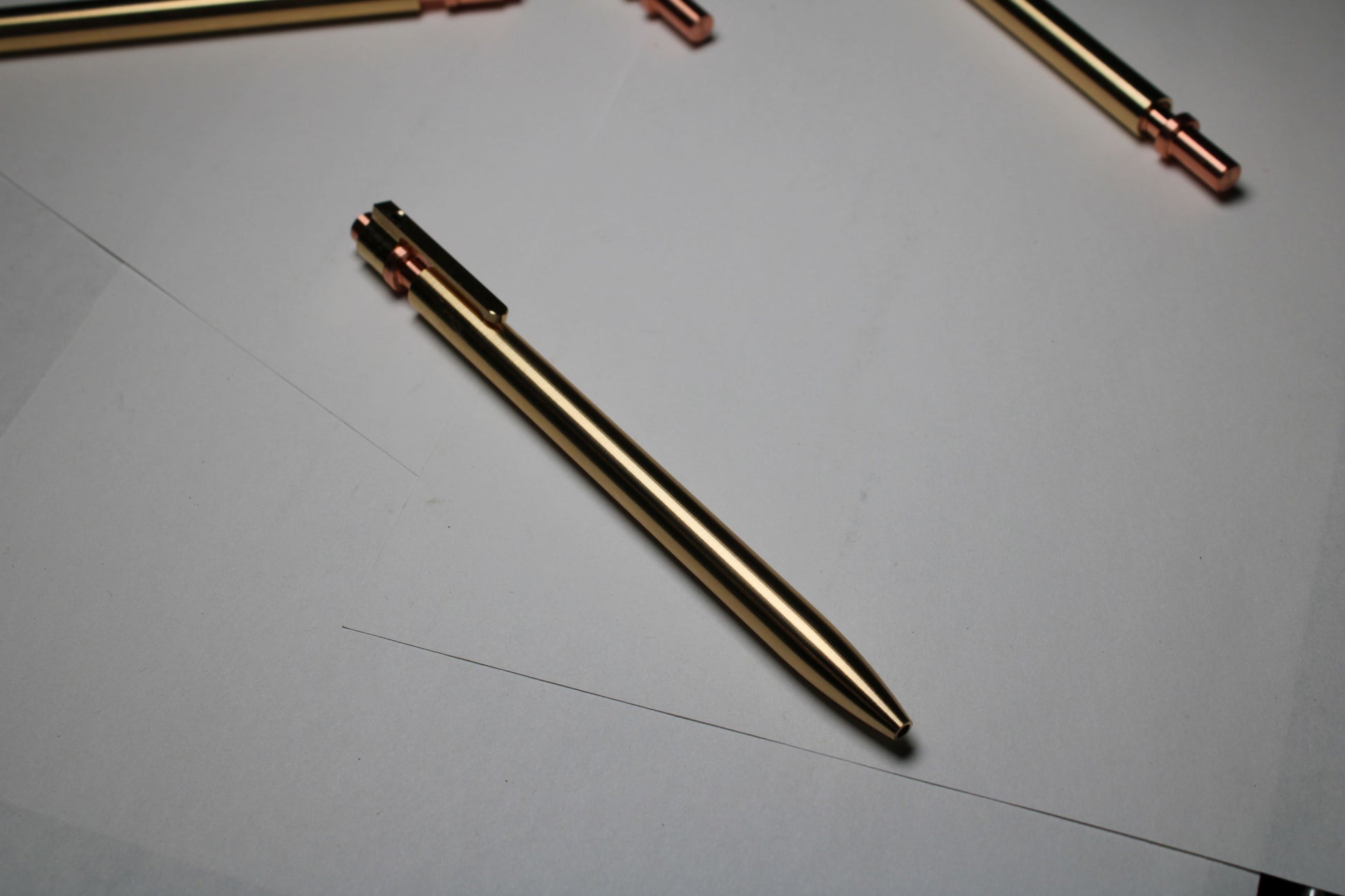 I just made a few of these fresh! Made from my favorite material 464 Naval Brass with a C110 Copper Top. This material is incredible. It is very tough, hard to scratch, doesn't tarnish, and has an incredible appearance. Decent heft to the body enough to make the pen feel substantial but not overly heavy in the pocket. Clean machined finishes straight off of the machines, made one at a time and I pay very close attention to the tolerances and surface finishes. 5-1/2" (140mm) long and 0.36" (9.1mm) in diameter. 39g (1.38oz) in weight. Super durable triple start screw mechanism. Carbide drill makes the hole in the tip at very precise tolerance of 25 micron. Rollerball style refills fit very snug in the tip leaving no room for the refill to click around in the pen. Comes with a very smooth writing Pilot G2 Refill and a matching brass clip.