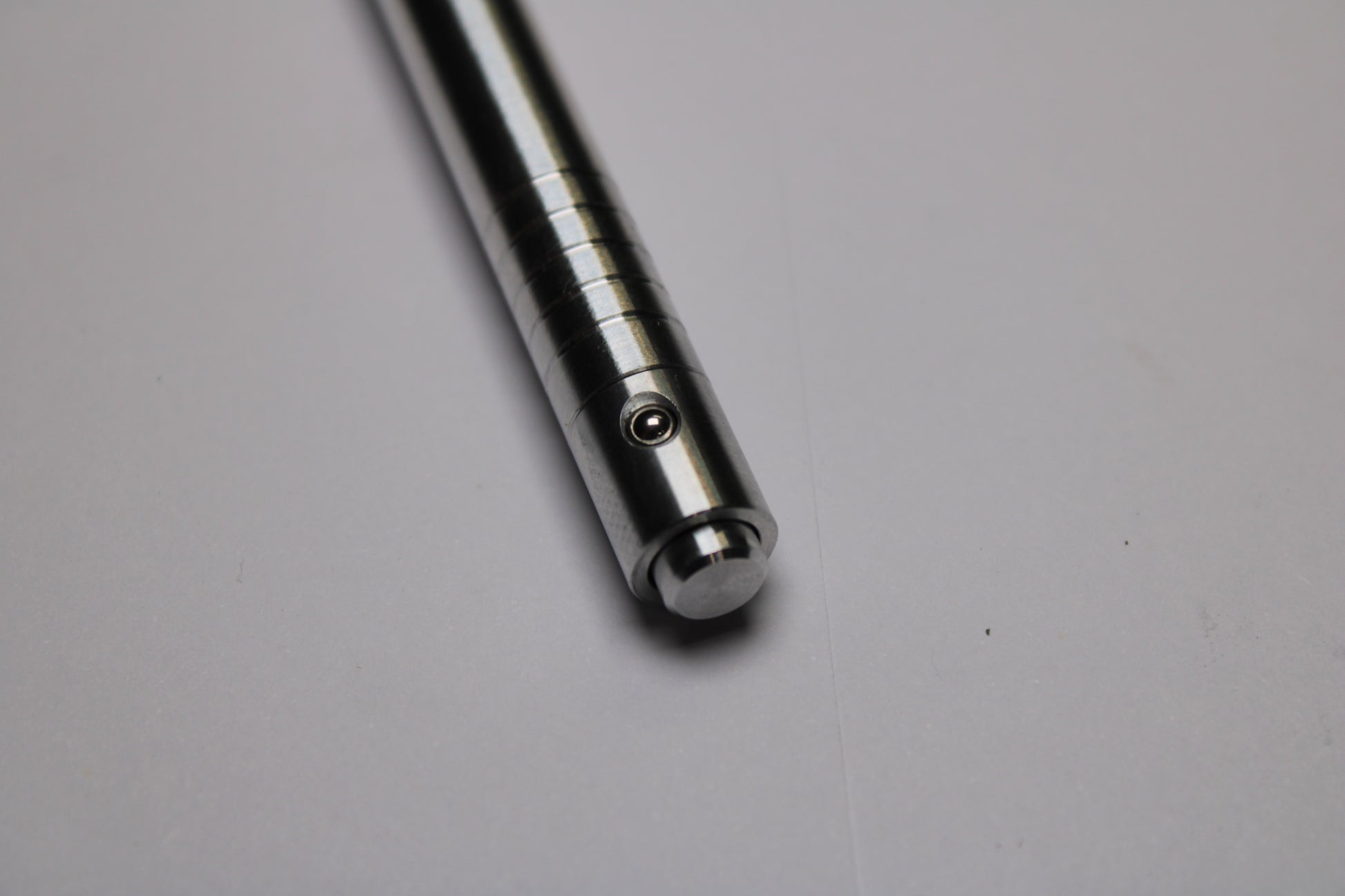 Grip diameter is bumped out to 0.40" (10.16mm). Mechanism in the 0.38"(9.65 mm) diameter. Action is very smooth and lightweight in feel, with a snap. Uses a 1/8" (0.125") Stainless Steel bearing ball.