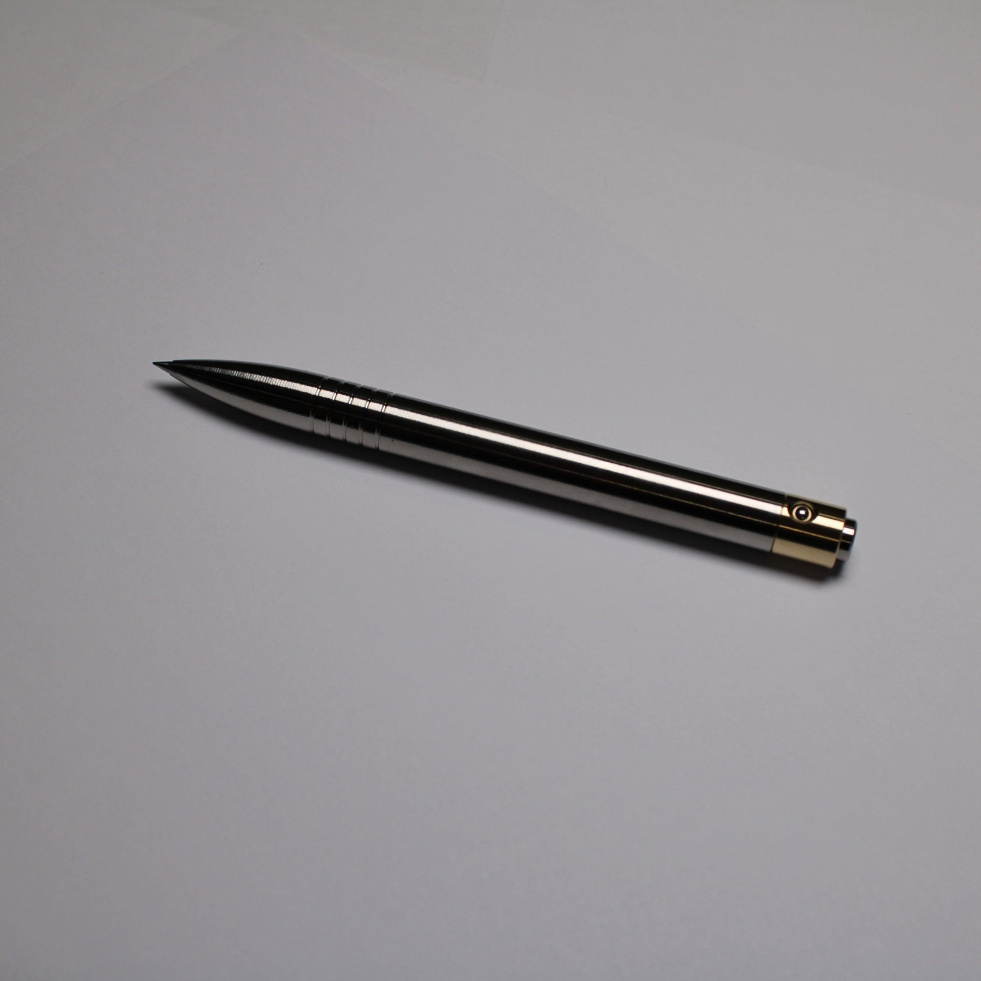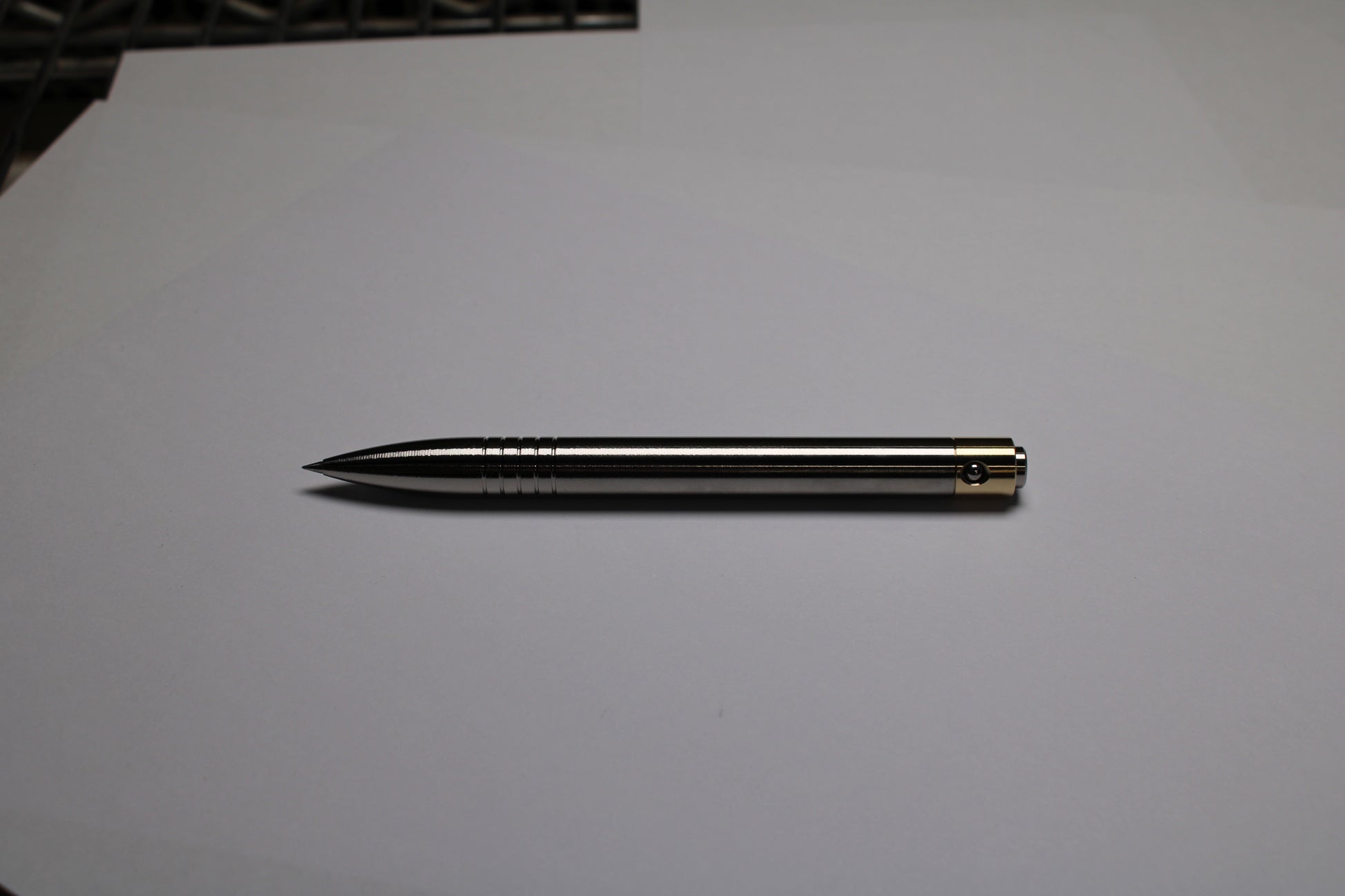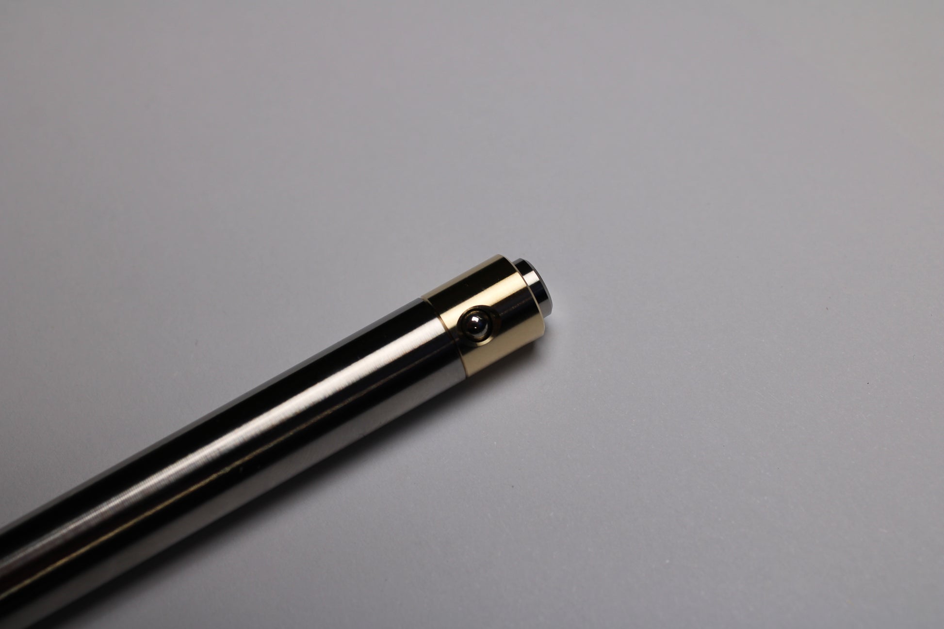 Made out of the tough and hard solid bar stock 6Al-4V Grade 5 Titanium. A single 0.45" (11.43 mm) diameter grip, round nose section and grip grooves with texture for grip. The mechanism comes equipped with stainless steel bearing balls. Tip details are extremely tight with a small land between the refill, and the conical section.