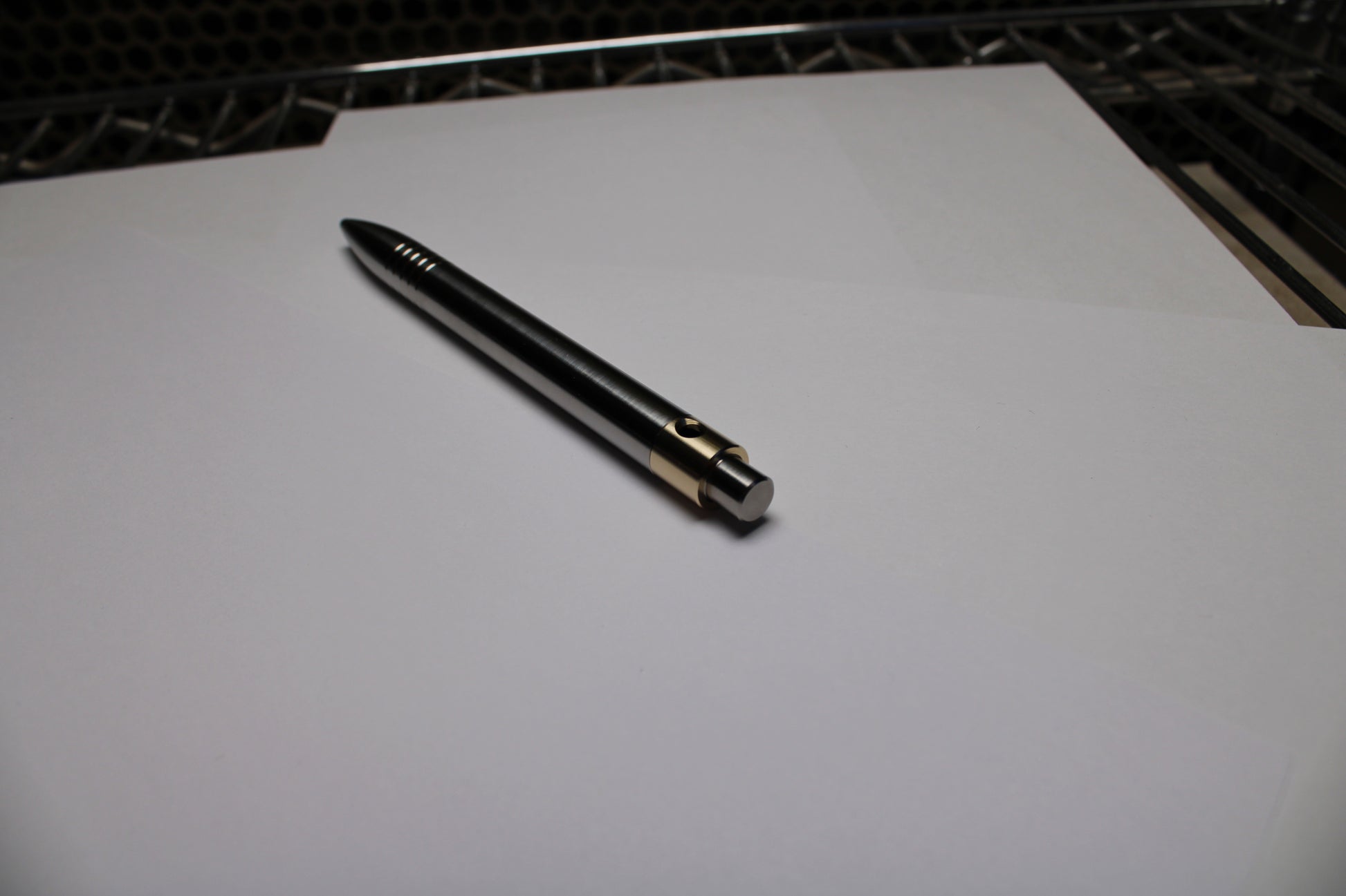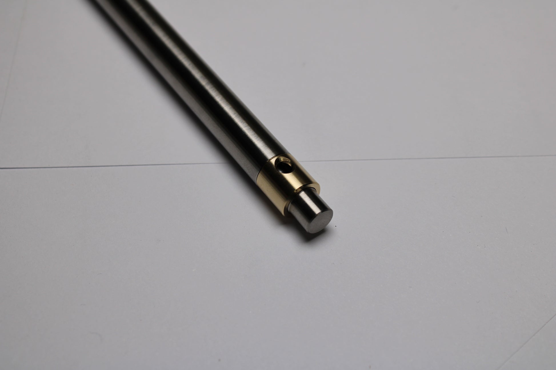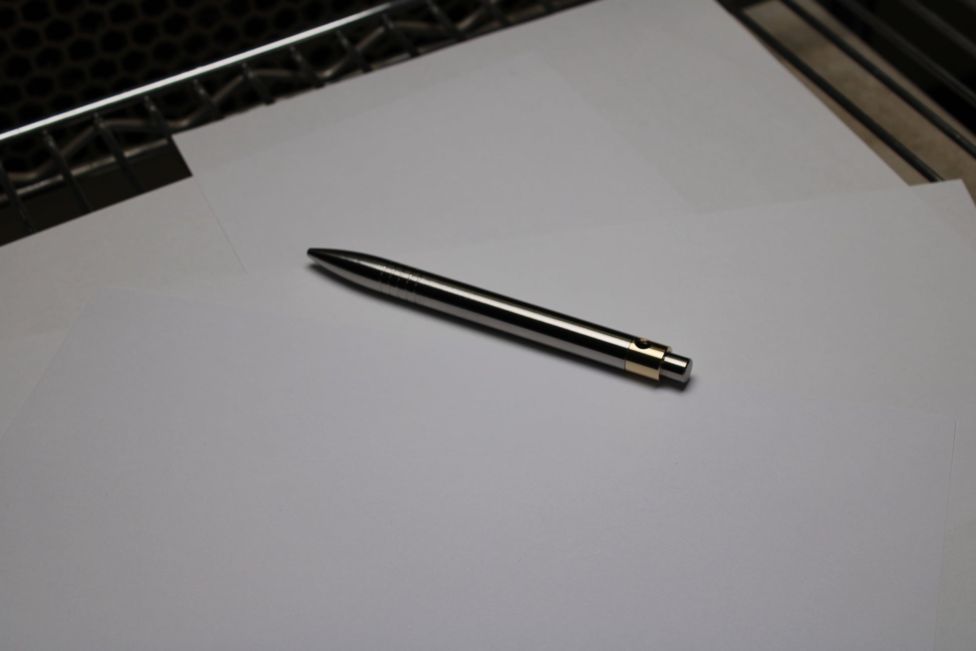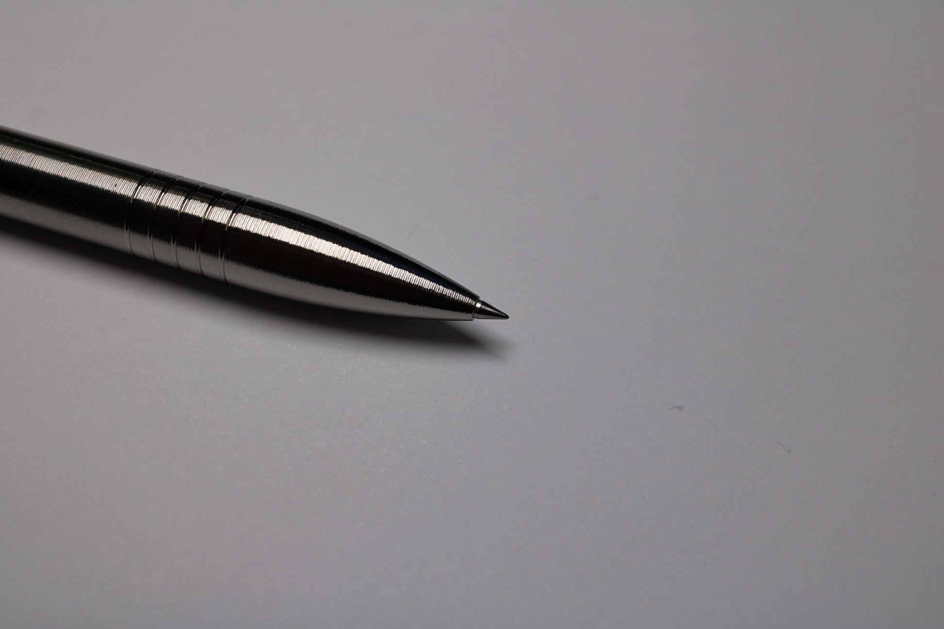 Made out of the tough and hard solid bar stock 6Al-4V Grade 5 Titanium. A single 0.45" (11.43 mm) diameter grip, round nose section and grip grooves with texture for grip. The mechanism comes equipped with stainless steel bearing balls. Tip details are extremely tight with a small land between the refill, and the conical section.