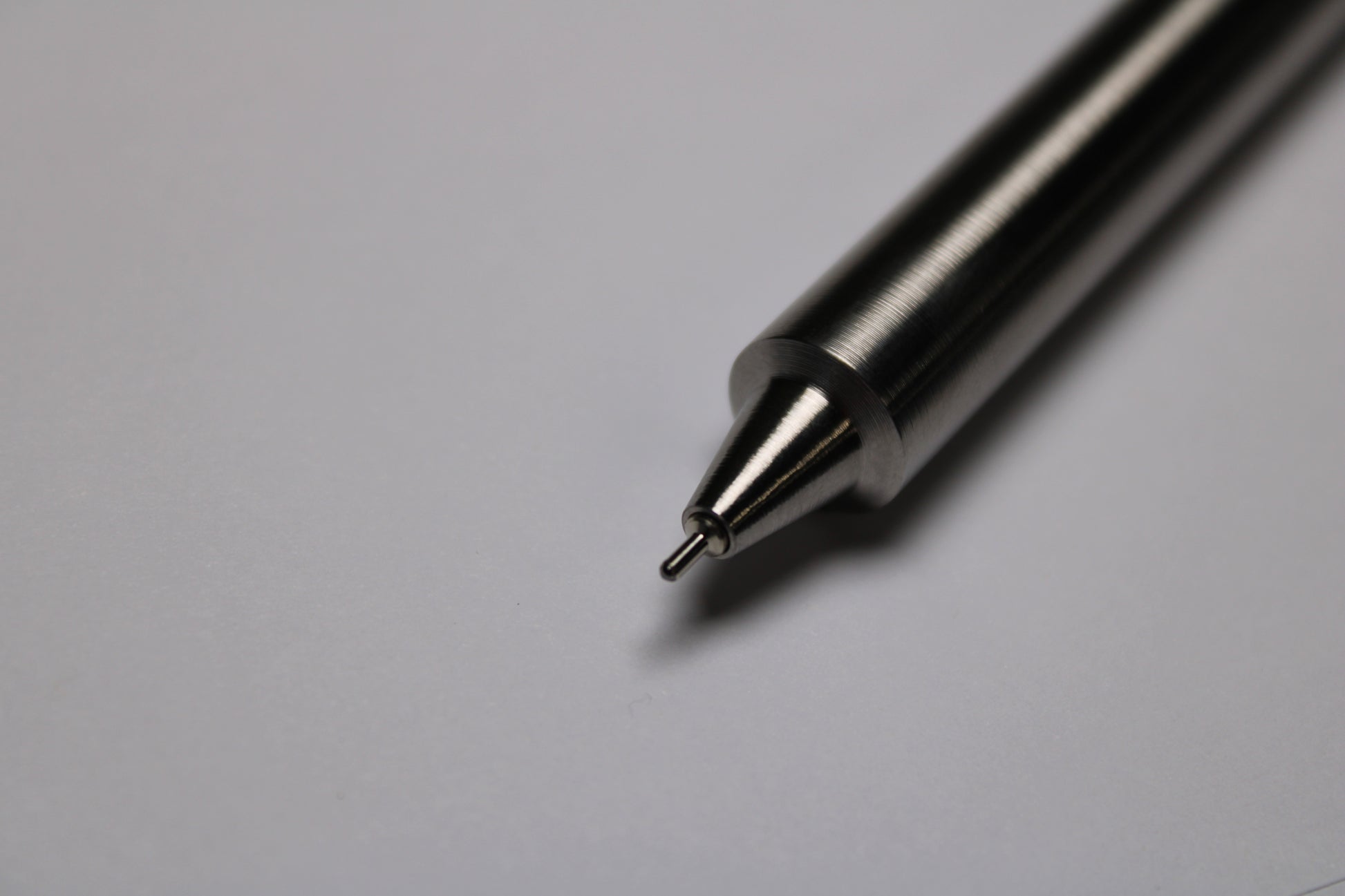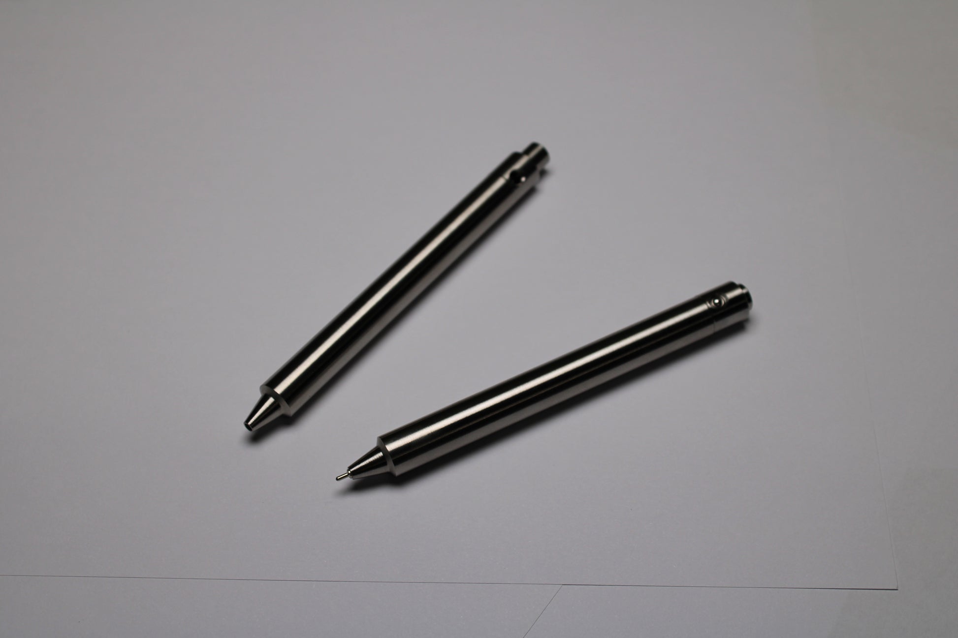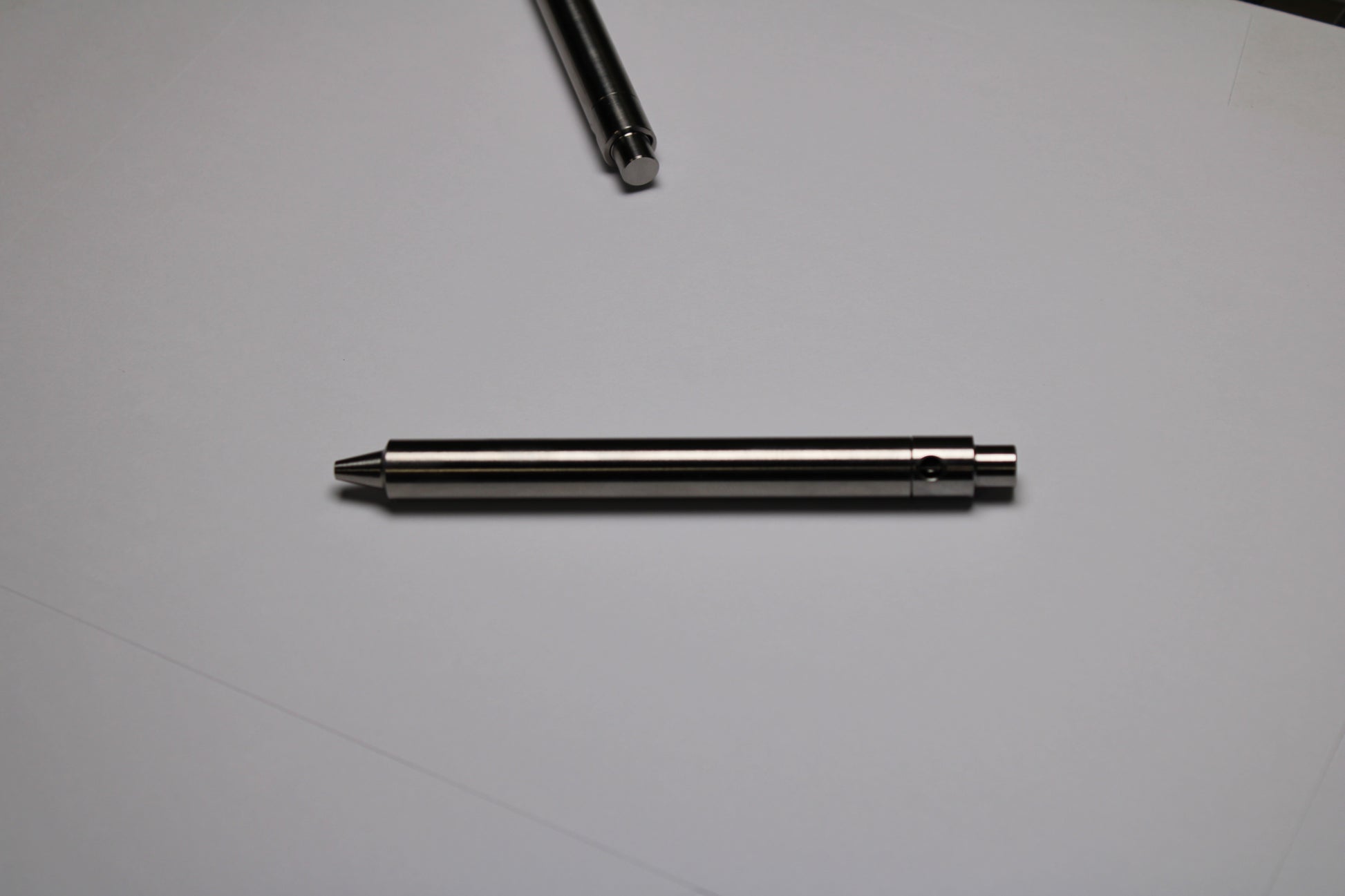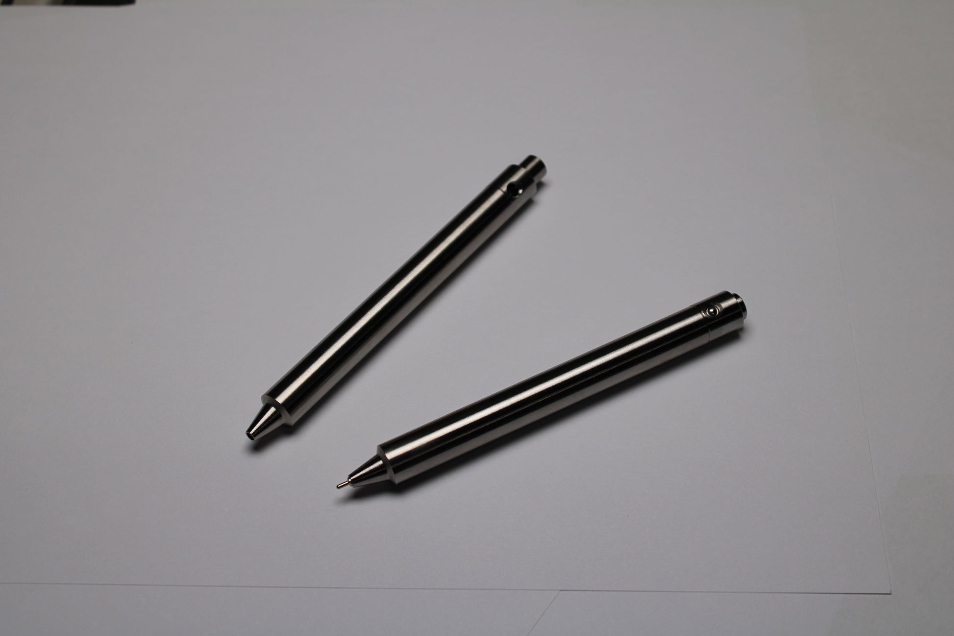 Made out of the tough and hard solid bar stock 6Al-4V Grade 5 Titanium. A single 0.45" (11.43mm) diameter grip, stepped nose section and continuous body finish with texture for grip. The mechanism comes equipped with stainless steel bearing balls. Tip details are extremely tight with a small land between the refill, and the conical section.