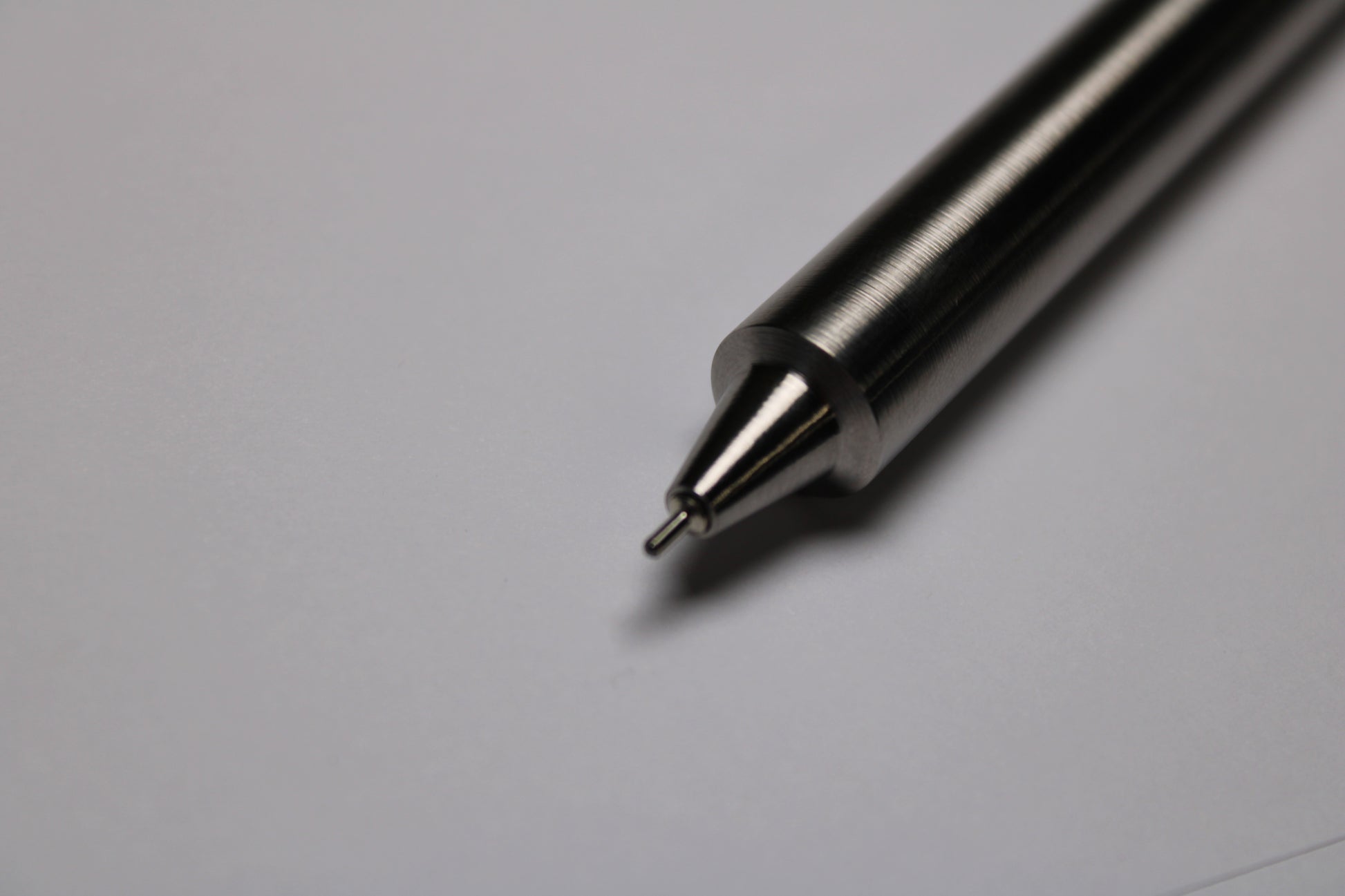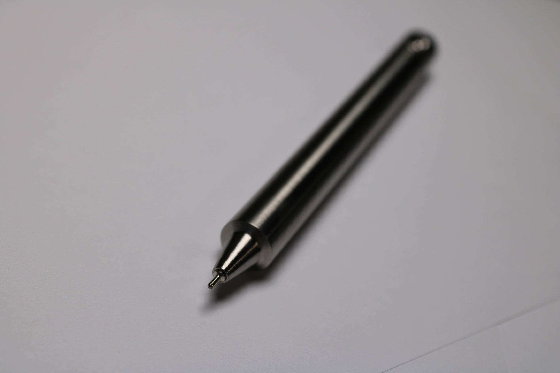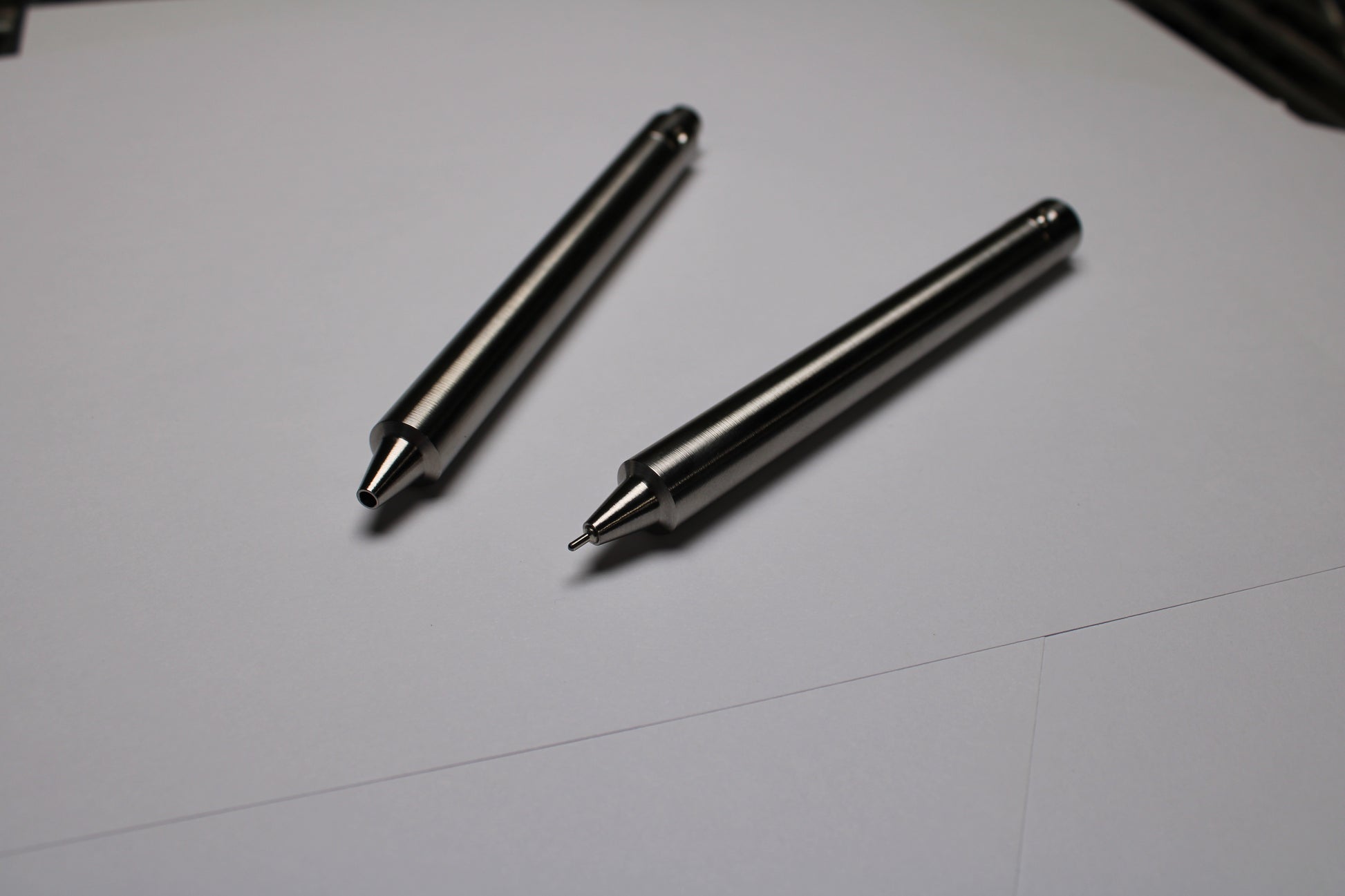 Made out of the tough and hard solid bar stock 6Al-4V Grade 5 Titanium. A single 0.45" (11.43mm) diameter grip, stepped nose section and continuous body finish with texture for grip. The mechanism comes equipped with stainless steel bearing balls. Tip details are extremely tight with a small land between the refill, and the conical section.