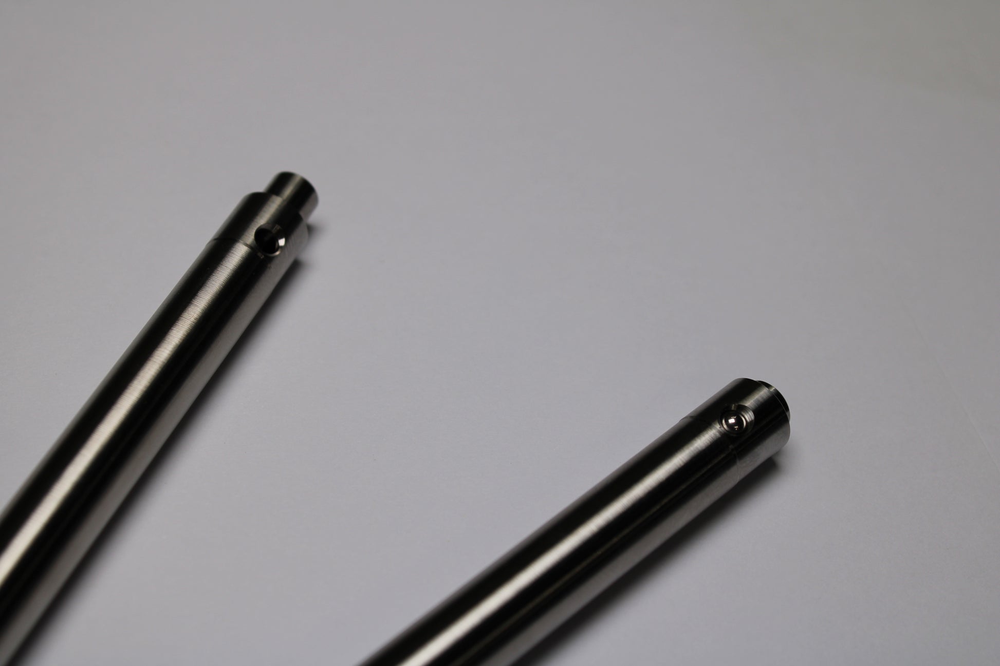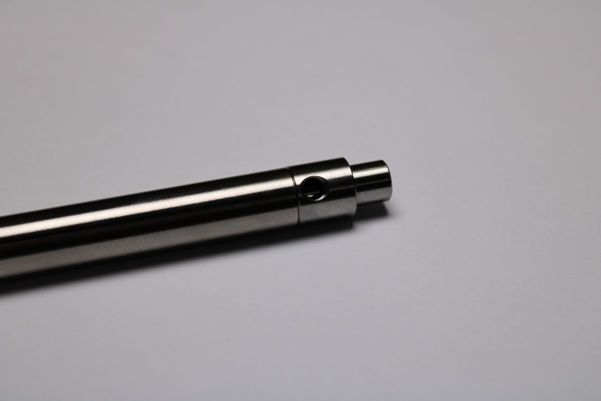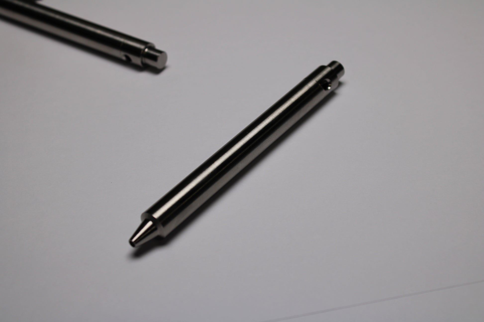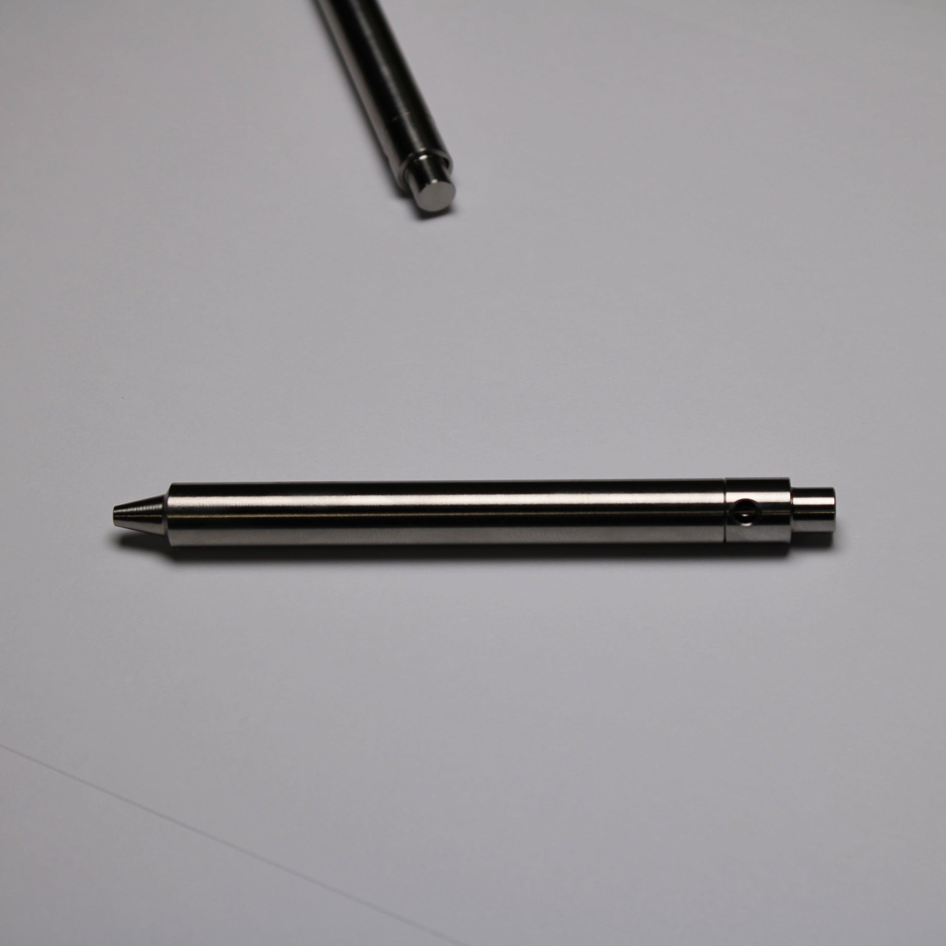 Made out of the tough and hard solid bar stock 6Al-4V Grade 5 Titanium. A single 0.45" (11.43mm) diameter grip, stepped nose section and continuous body finish with texture for grip. The mechanism comes equipped with stainless steel bearing balls. Tip details are extremely tight with a small land between the refill, and the conical section.