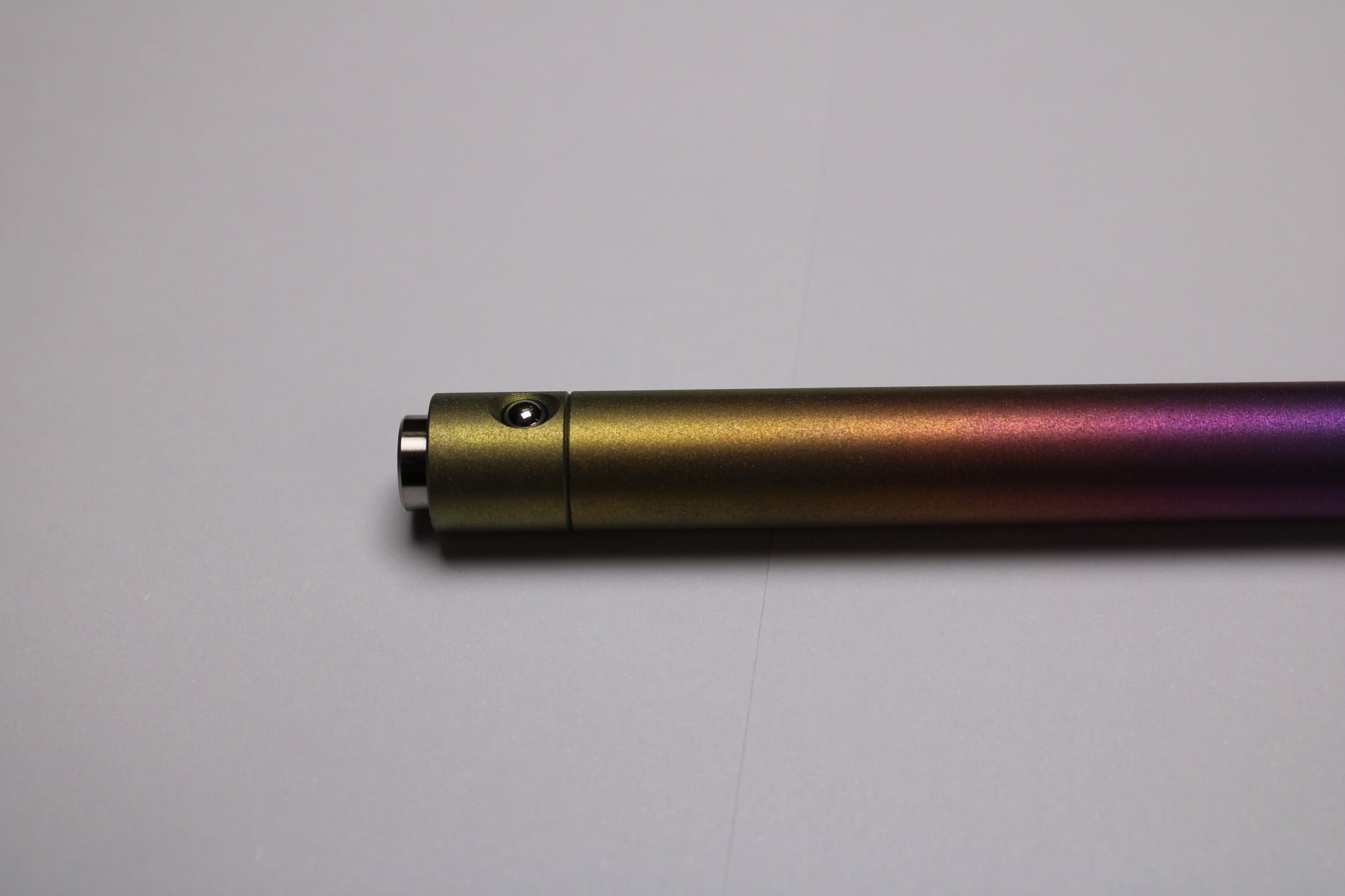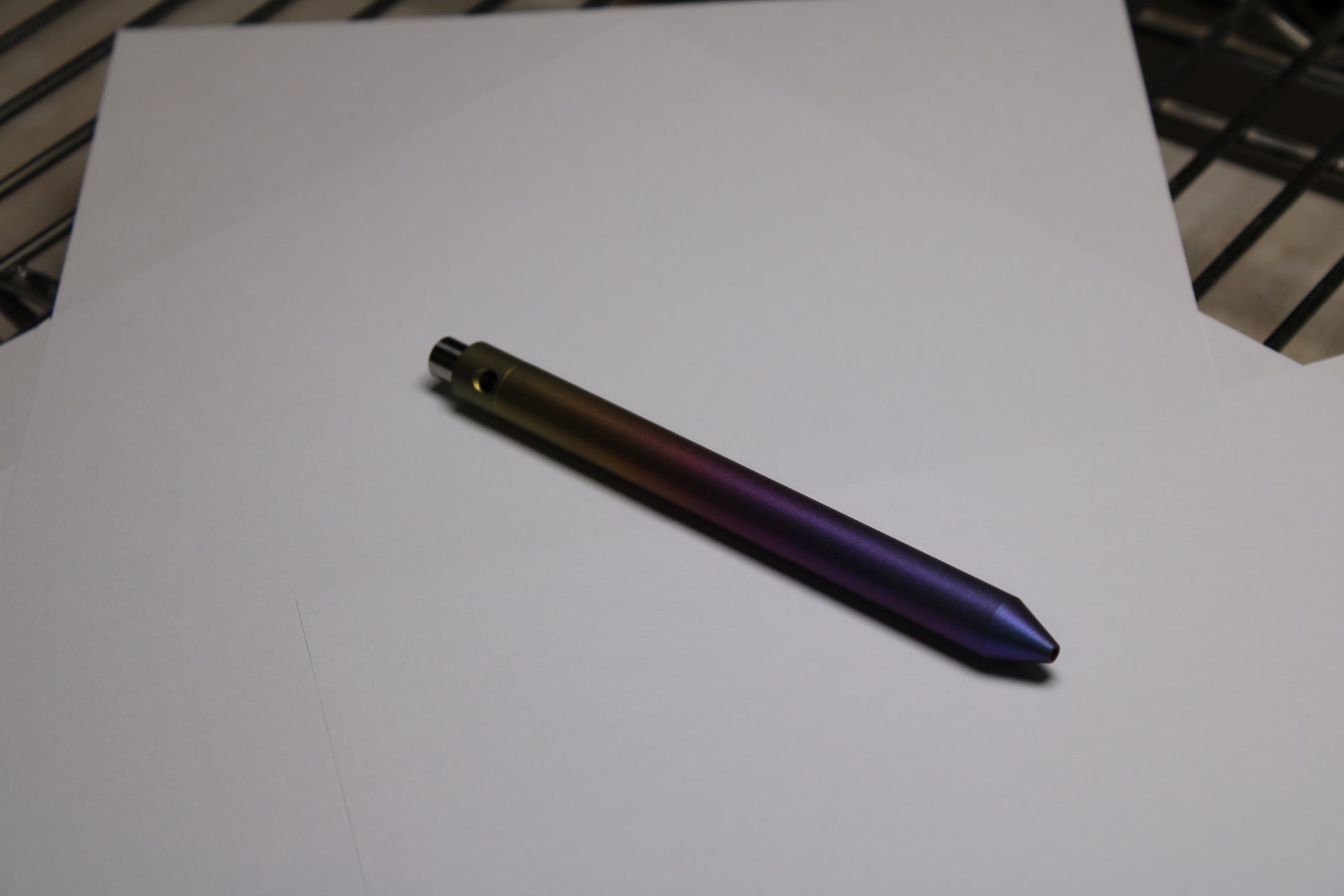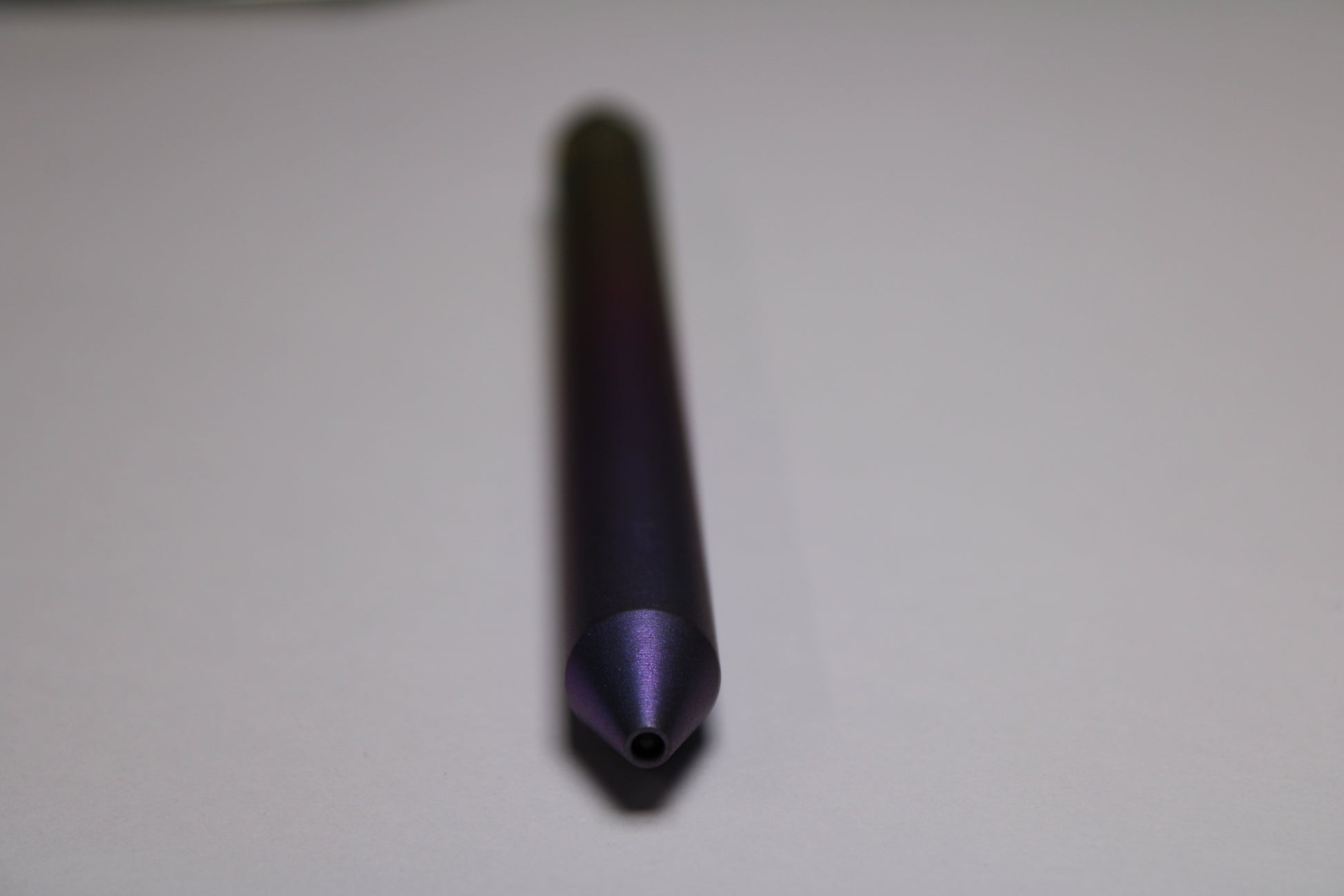 Made out of the tough and hard solid bar stock 6Al-4V Grade 5 Titanium. A single 0.45" (11.43mm) diameter grip, conical nose section and continuous body finish with texture for grip. The mechanism comes equipped with stainless steel bearing balls. Tip details are extremely tight with a small land between the refill, and the conical section.