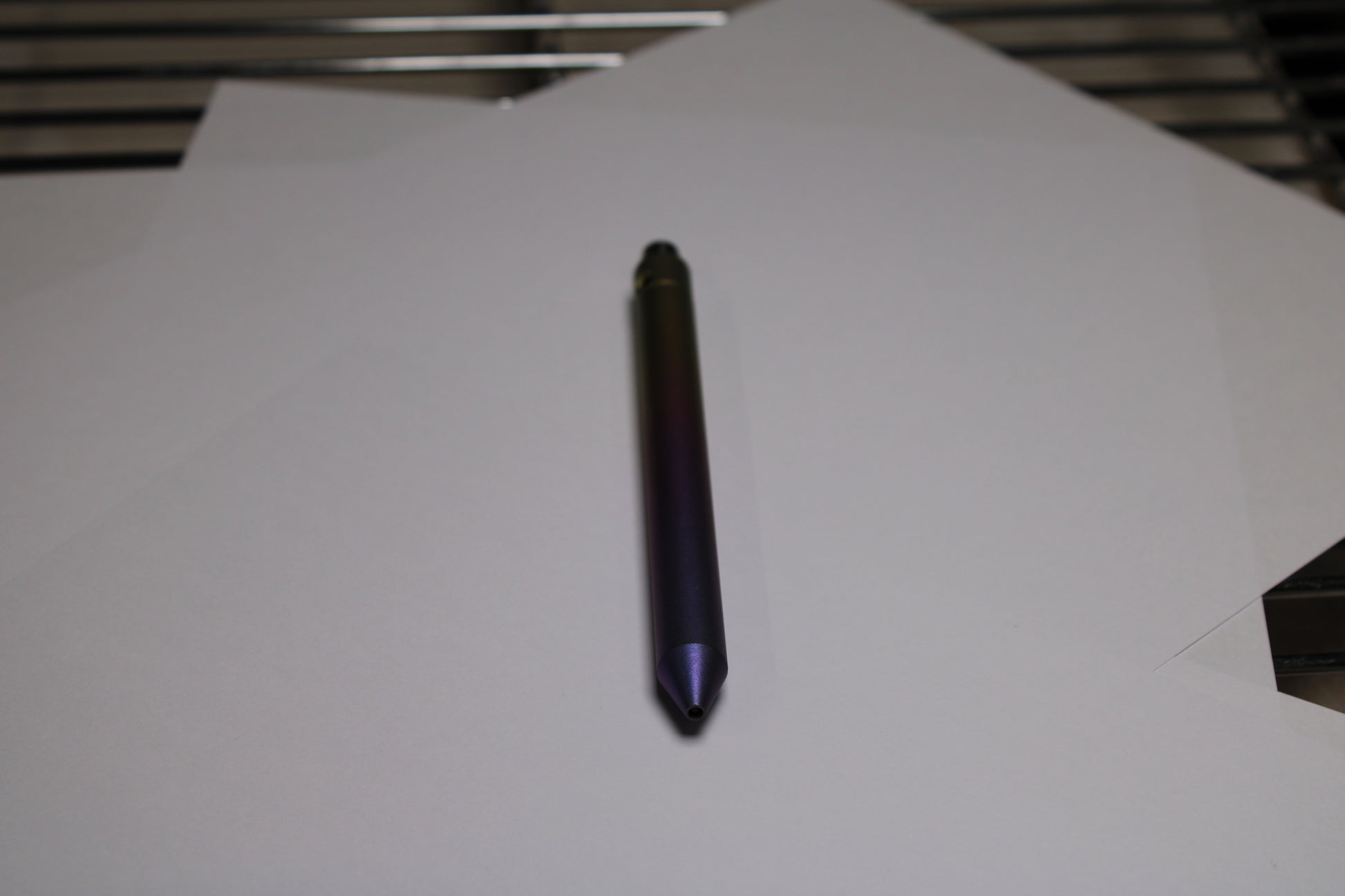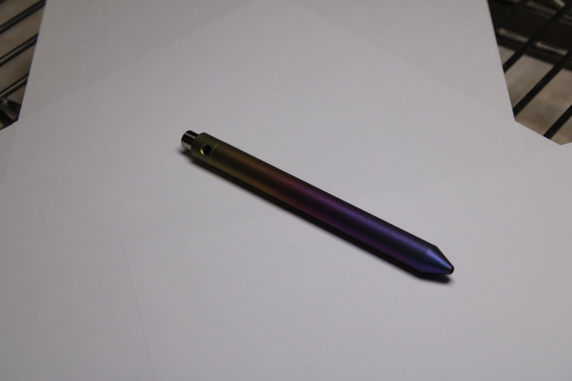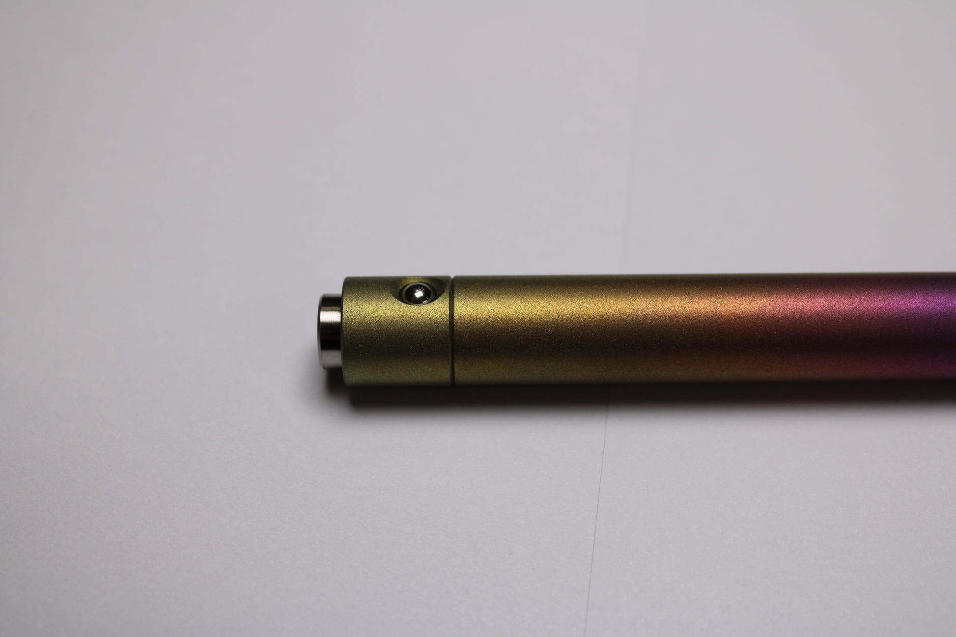 Made out of the tough and hard solid bar stock 6Al-4V Grade 5 Titanium. A single 0.45" (11.43mm) diameter grip, conical nose section and continuous body finish with texture for grip. The mechanism comes equipped with stainless steel bearing balls. Tip details are extremely tight with a small land between the refill, and the conical section.